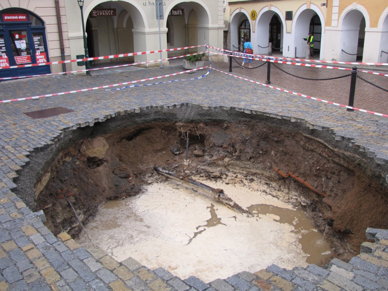Důlní činnost dala Kutné Hoře ve středověku slávu i krásu. Sláva, krása, ale i důlní díla zůstala. Vznik dolů byl mnohdy spontánní, spojený se soukromou aktivitou měšťanů, a dodnes nejsou všechny šachty zmapovány. Některé se, bohužel již ne zrovna příznivě, připomínají dodnes. Poslední sesuv šachty na rohu Šultysovy a Husovy ulice u Morového sloupu v létě 2012 způsobil i porušení vodovodního potrubí zásobující horní část historického města (obr.8).