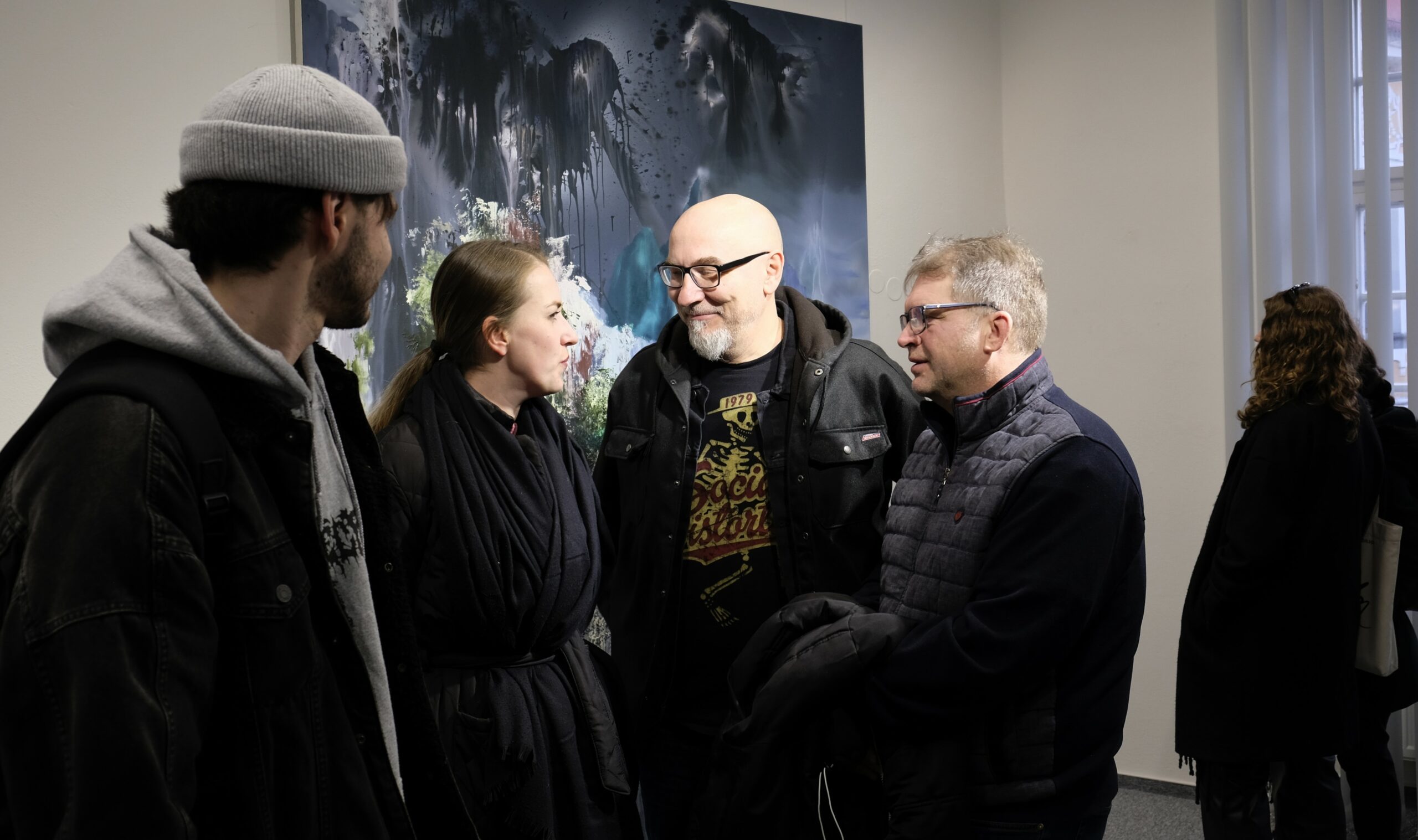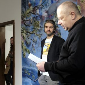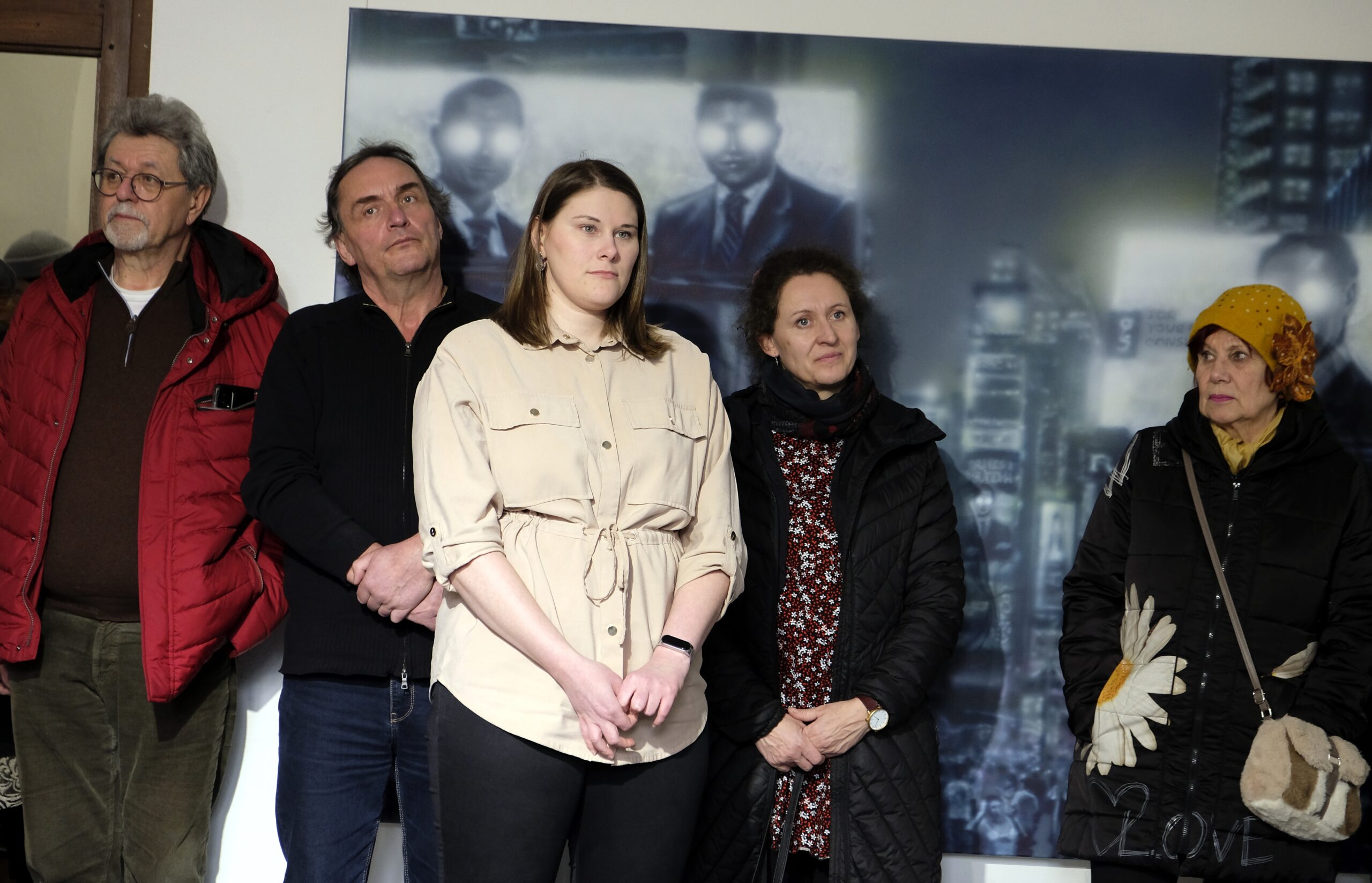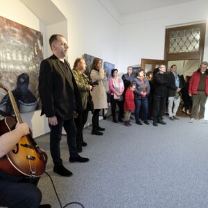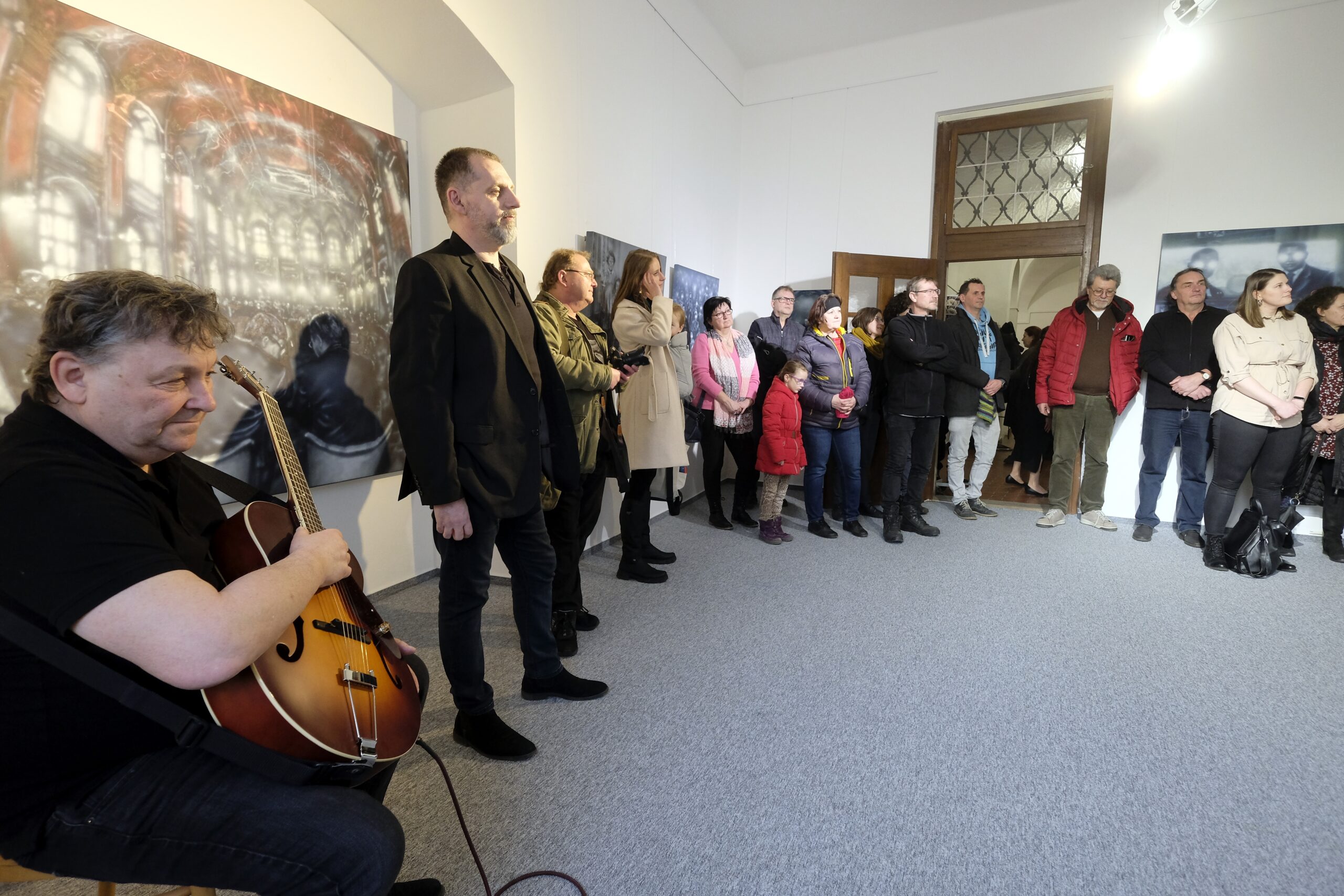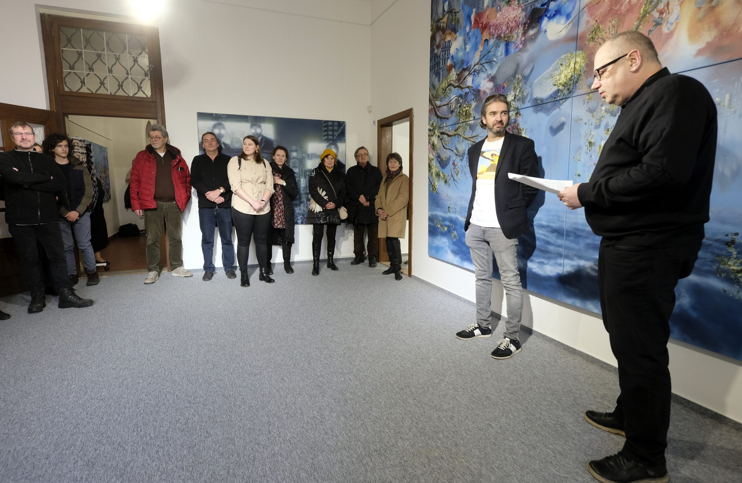 Aleš Rezler, kurátor výstavy, představil autora těmito slovy: „Michal ČERNUŠÁK (*1982) patří k výrazným představitelům slovenské velkoformátové figurální malby realizované pomocí kombinace akrylu a paintbrushe.Je absolventem Vysoké školy výtvarných umění v Bratislavě, atelieru malby Ivana Csudaie. Je zařazován do reprezentativních přehlídek současné malby nejen na Slovensku ale i v zahraničí. Zpracovává systematicky téma moderní společnosti, globalizace a konzumu. Po rannějším období monochromatických pláten přešel po roce 2010 k baroknímu víření barevných kompozic obsahující fragmenty zástupných výseků nejrůznějších lidských skupin, jejich činností. Podává vířící obraz hroutícího se světa absolutního pluralismu zahrnující úryvky z davových scén válečné aktivity, byznysu, reklamy, marketingu nebo masové relaxace moderní společnosti. Smysl pro barvu a formu v kombinaci s monumentálním přednesem zaručuje Černušákovi maximální přesvědčivost výrazu. Je zastoupen v řadě významných veřejných sbírek na Slovensku a v zahraničí. Sammlung Essl, Wien-Klosteneuburg (A); European Central Bank, Frankfurt am Main (D); Marek Collection, Brno (CZ); Wannieck gallery, Brno (CZ); DvorakSec Gallery, Praha (CZ); Galéria mesta Bratislavy – GMB, Bratislava (S).“ Hudebního zpestření vernisáže se ujal kytarista Jiří Červín.