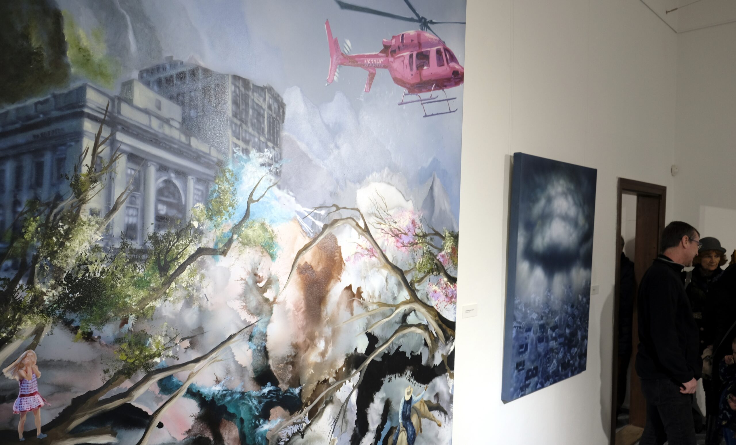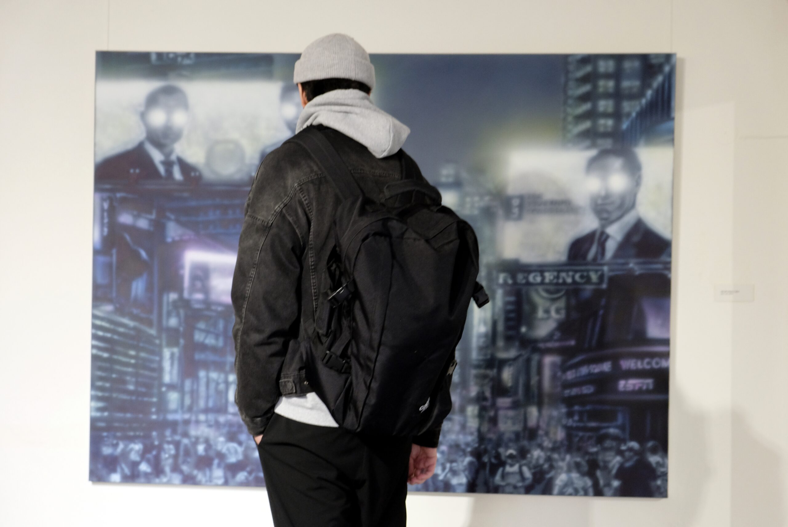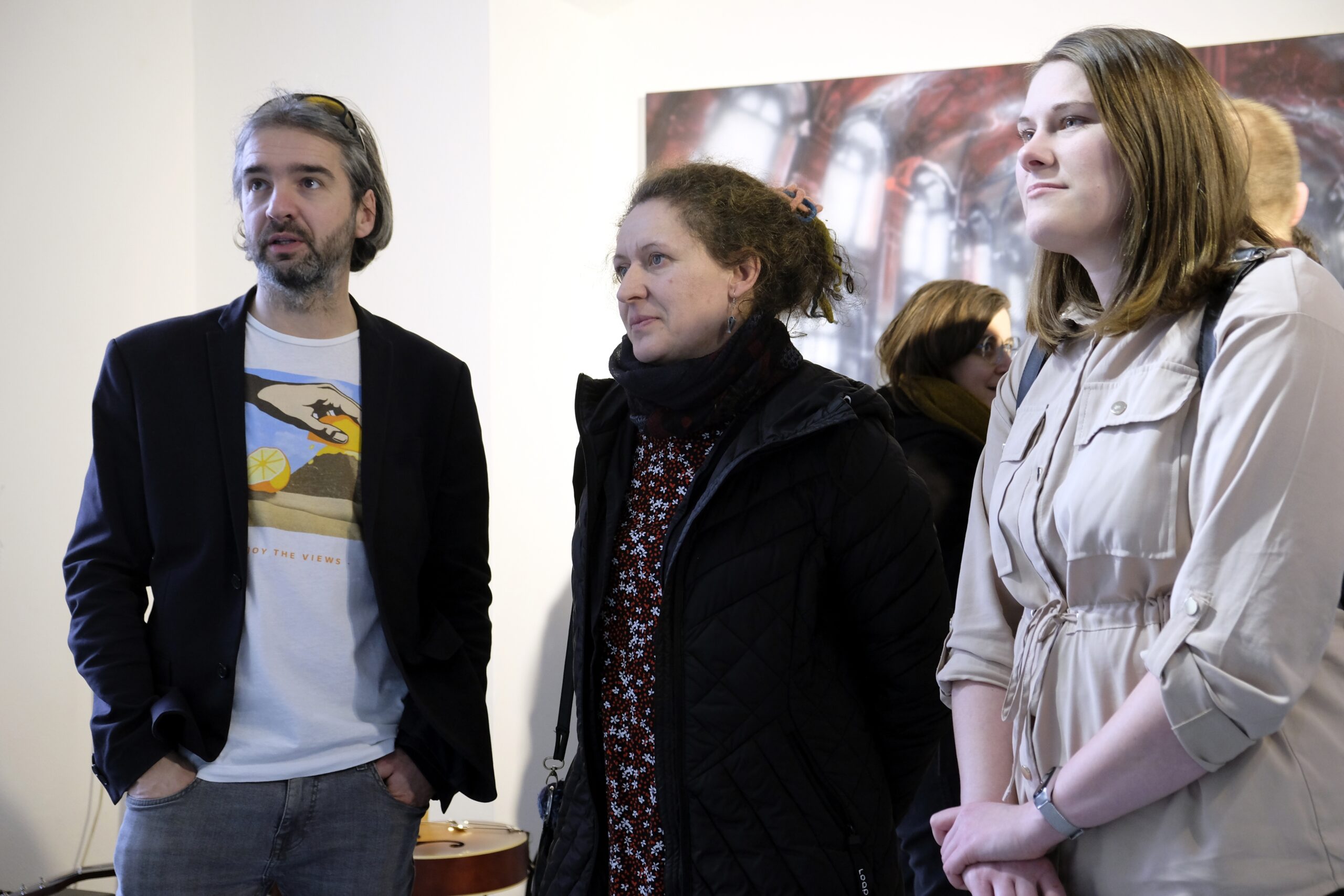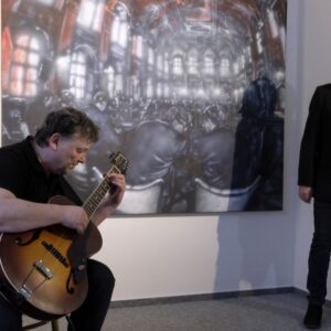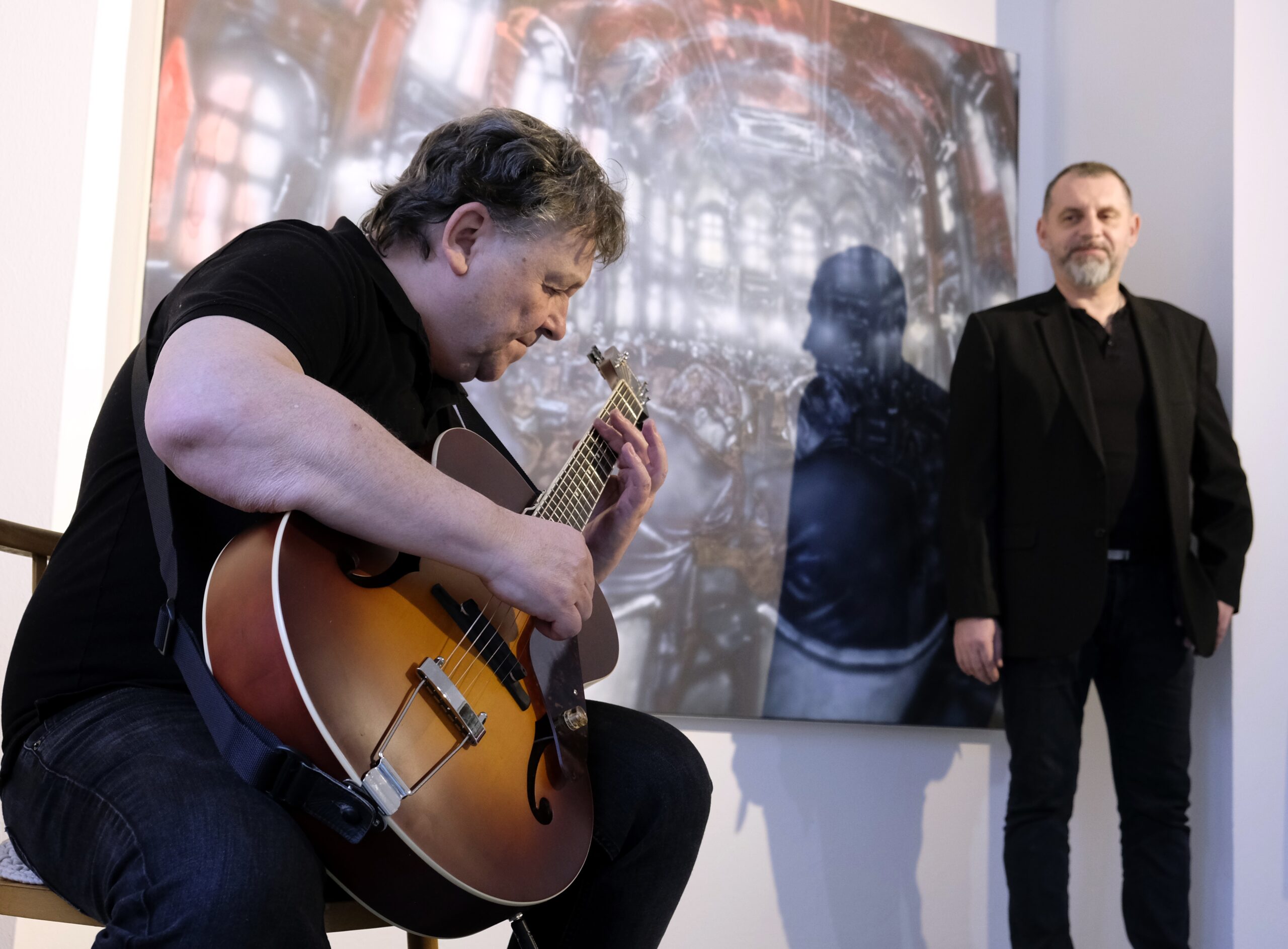 Aleš Rezler, kurátor výstavy, představil autora těmito slovy: „Michal ČERNUŠÁK (*1982) patří k výrazným představitelům slovenské velkoformátové figurální malby realizované pomocí kombinace akrylu a paintbrushe.Je absolventem Vysoké školy výtvarných umění v Bratislavě, atelieru malby Ivana Csudaie. Je zařazován do reprezentativních přehlídek současné malby nejen na Slovensku ale i v zahraničí. Zpracovává systematicky téma moderní společnosti, globalizace a konzumu. Po rannějším období monochromatických pláten přešel po roce 2010 k baroknímu víření barevných kompozic obsahující fragmenty zástupných výseků nejrůznějších lidských skupin, jejich činností. Podává vířící obraz hroutícího se světa absolutního pluralismu zahrnující úryvky z davových scén válečné aktivity, byznysu, reklamy, marketingu nebo masové relaxace moderní společnosti. Smysl pro barvu a formu v kombinaci s monumentálním přednesem zaručuje Černušákovi maximální přesvědčivost výrazu. Je zastoupen v řadě významných veřejných sbírek na Slovensku a v zahraničí. Sammlung Essl, Wien-Klosteneuburg (A); European Central Bank, Frankfurt am Main (D); Marek Collection, Brno (CZ); Wannieck gallery, Brno (CZ); DvorakSec Gallery, Praha (CZ); Galéria mesta Bratislavy – GMB, Bratislava (S).“ Hudebního zpestření vernisáže se ujal kytarista Jiří Červín.