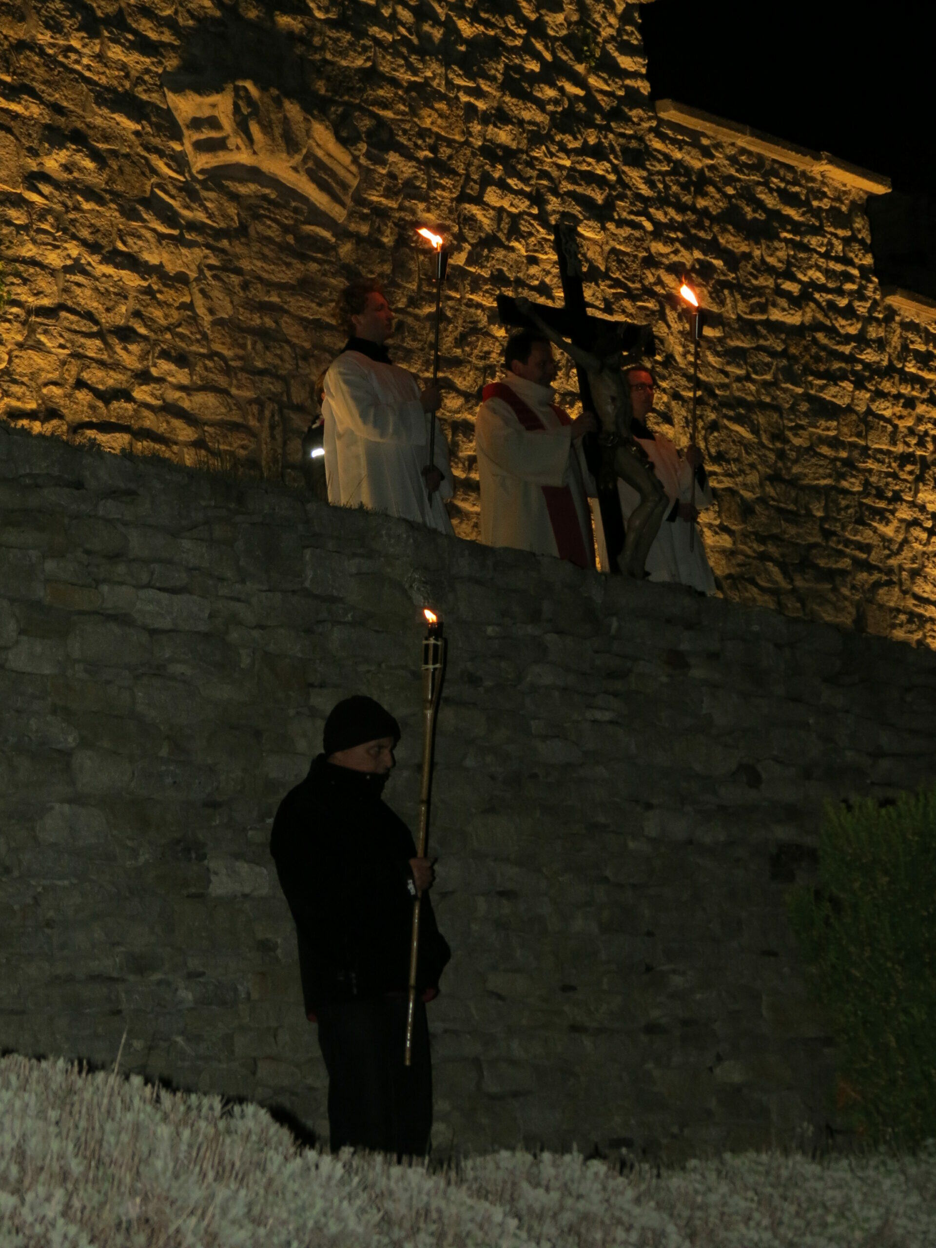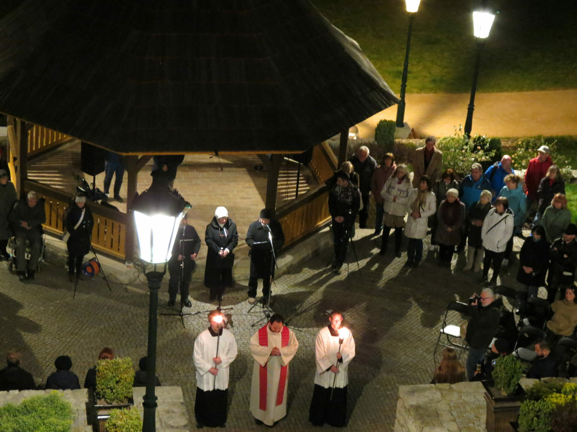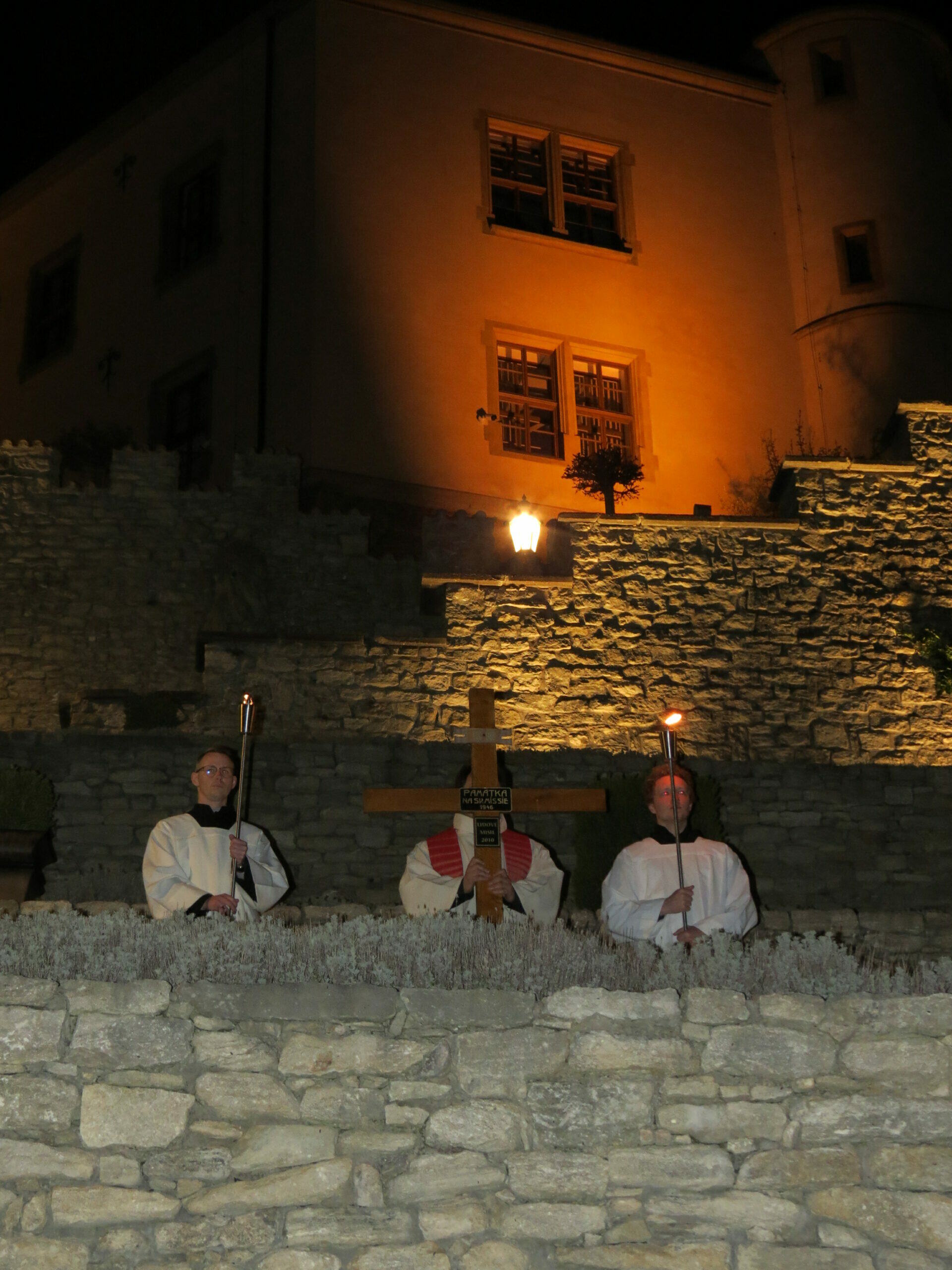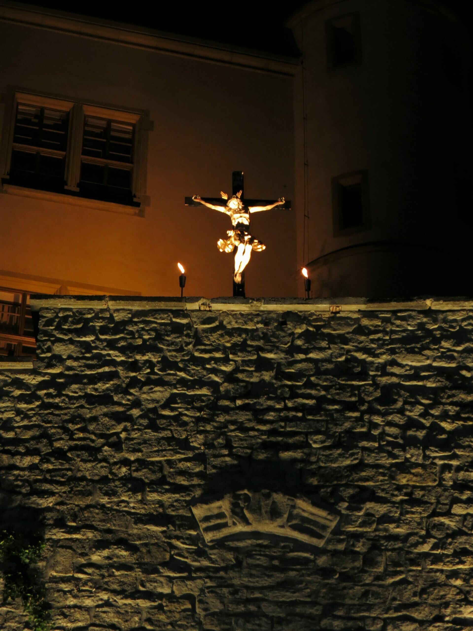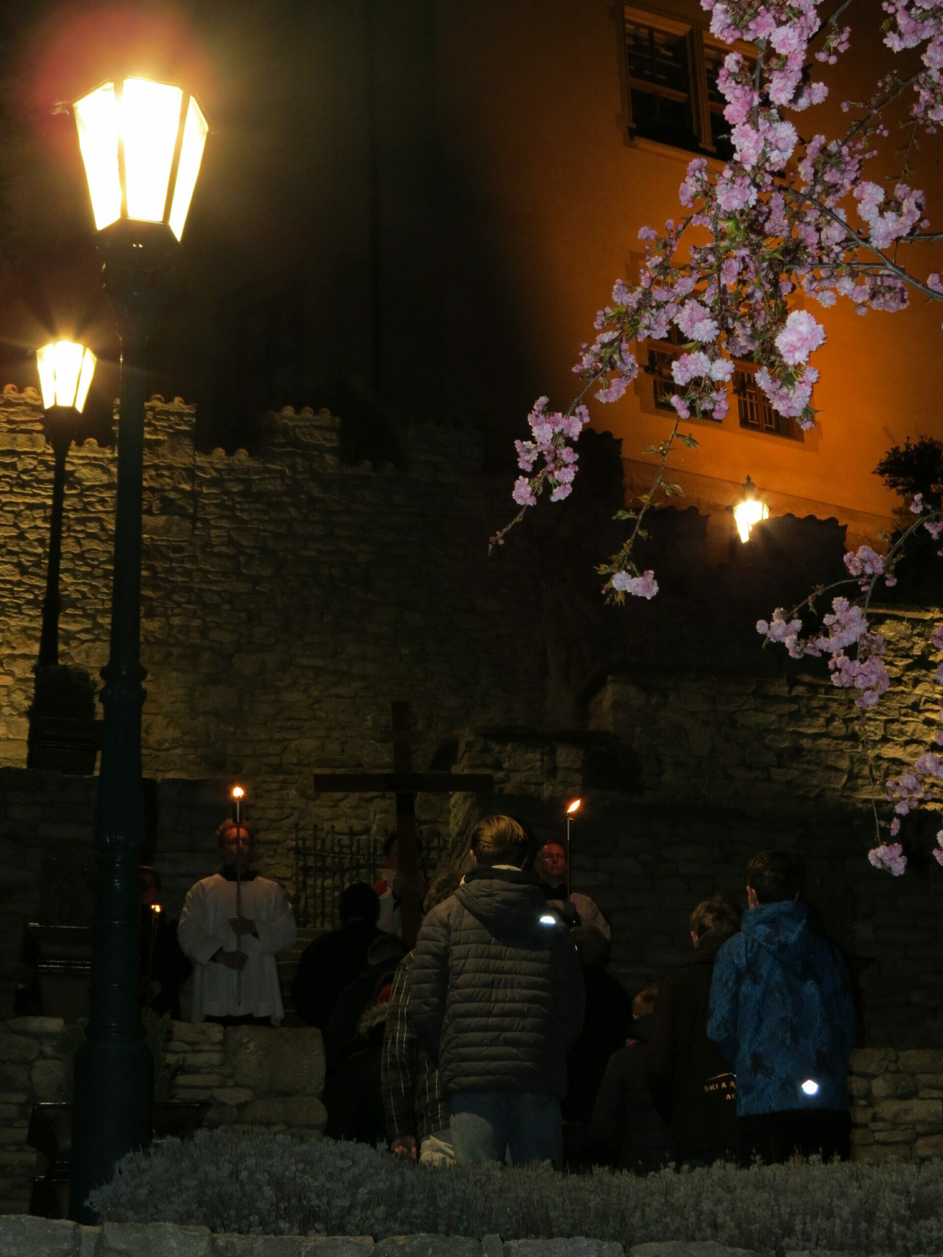 Meditativní setkání uspořádala farnost v Breüerových sadech pod Vlašským dvorem, kde diváci poslouchali meditace, čtení, vokace (zvolání) a zamyšlení týkající se jak nejdůležitějšího křesťanského svátku, tak i současné doby, za světel pochodní. Celou Ježíšovou cestou na horu Golgota posluchače provázely meditace Marie Mackové, Karel Macek předčítal z Bible a František Malík pronášel vokace. Vlastní křížovou cestu vedl farář Jan Uhlíř, režisérem a autorem celé kompozice a textu je Michal Šramko.