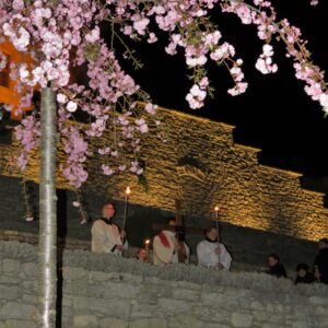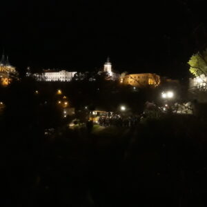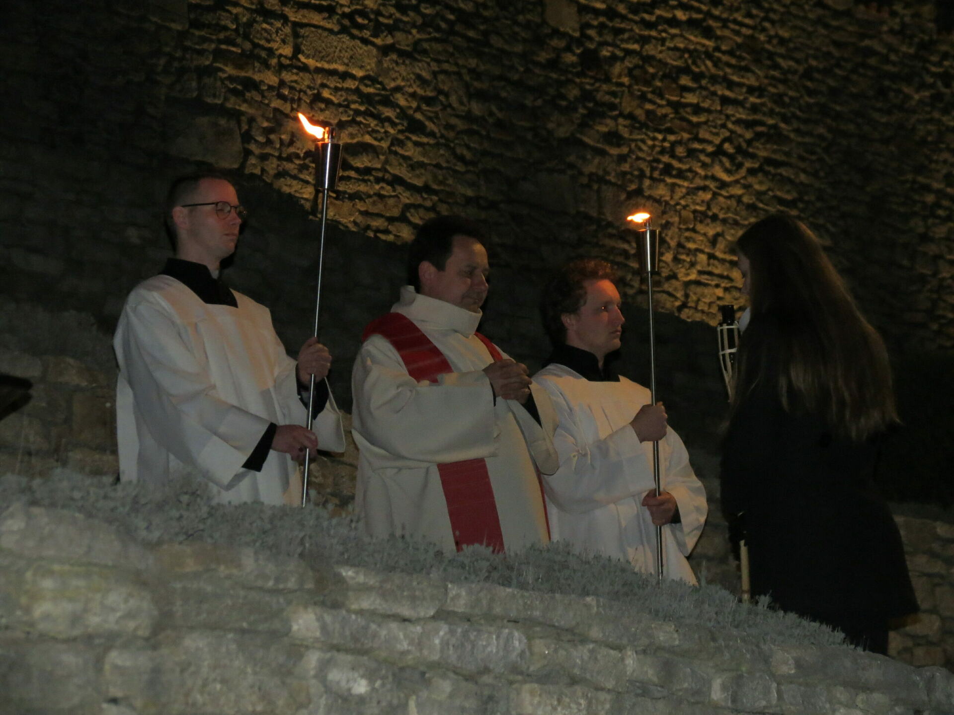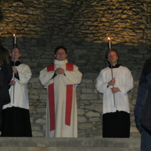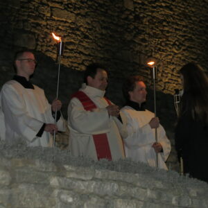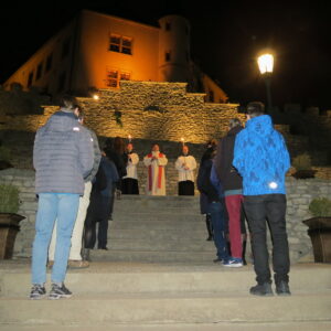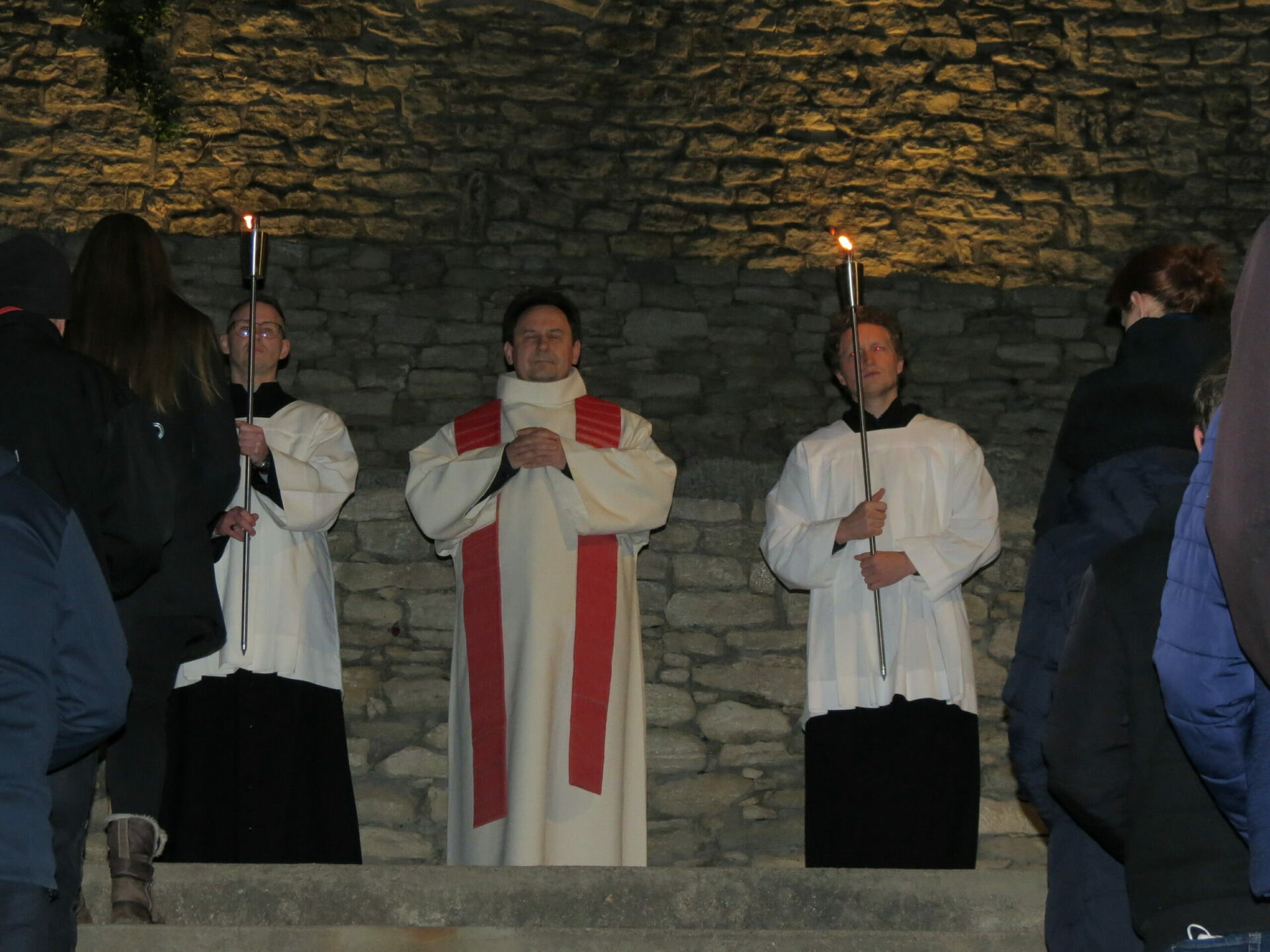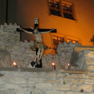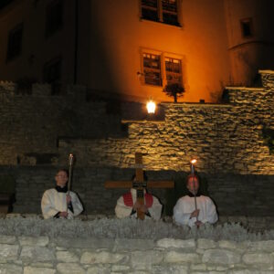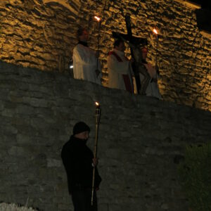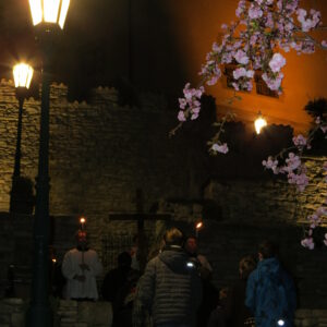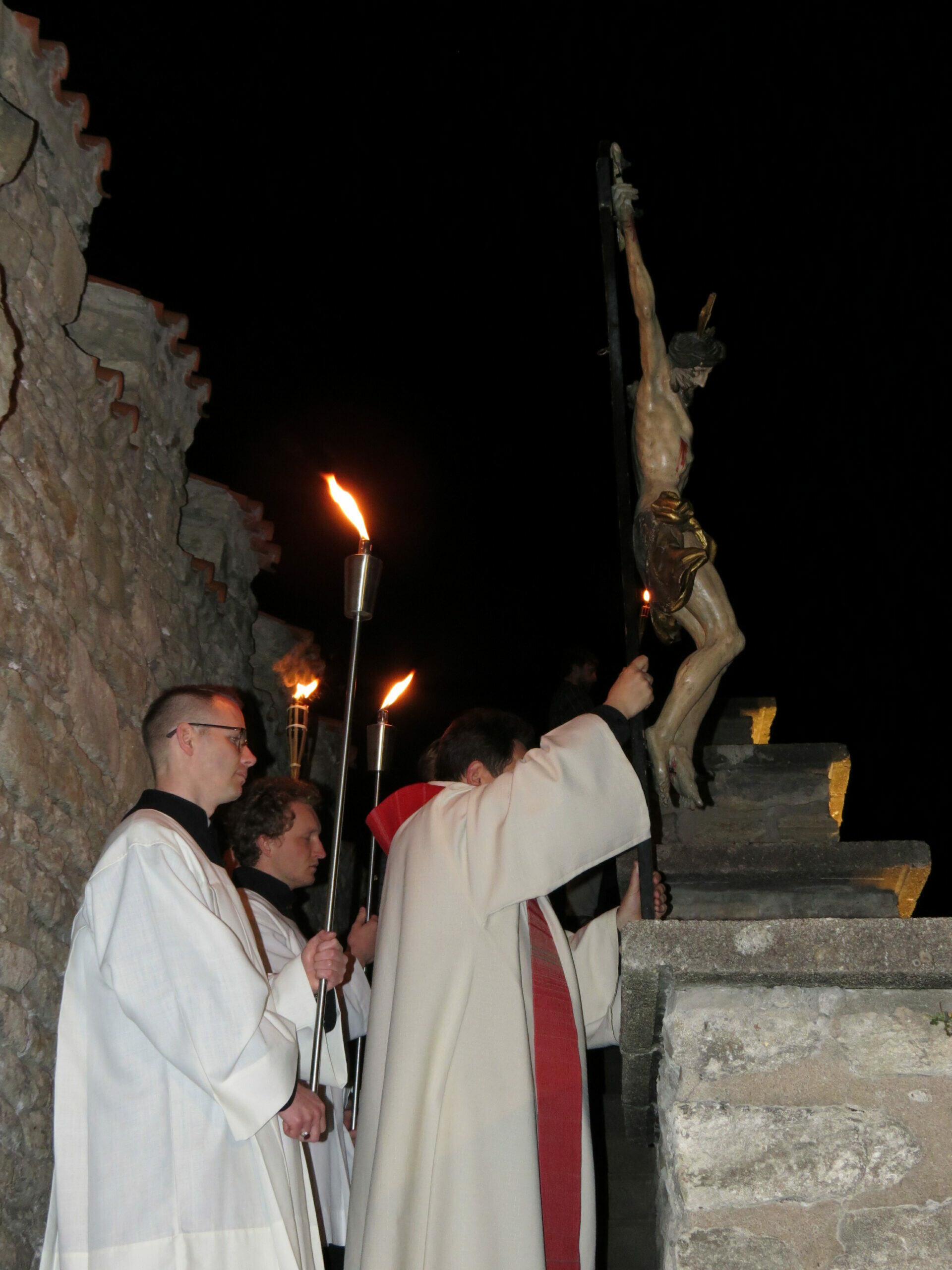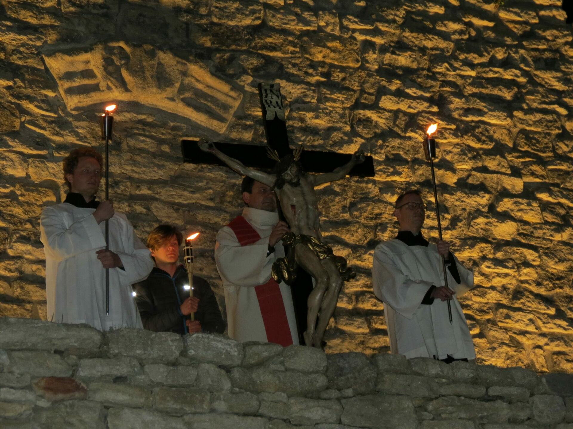 Meditativní setkání uspořádala farnost v Breüerových sadech pod Vlašským dvorem, kde diváci poslouchali meditace, čtení, vokace (zvolání) a zamyšlení týkající se jak nejdůležitějšího křesťanského svátku, tak i současné doby, za světel pochodní. Celou Ježíšovou cestou na horu Golgota posluchače provázely meditace Marie Mackové, Karel Macek předčítal z Bible a František Malík pronášel vokace. Vlastní křížovou cestu vedl farář Jan Uhlíř, režisérem a autorem celé kompozice a textu je Michal Šramko.