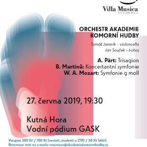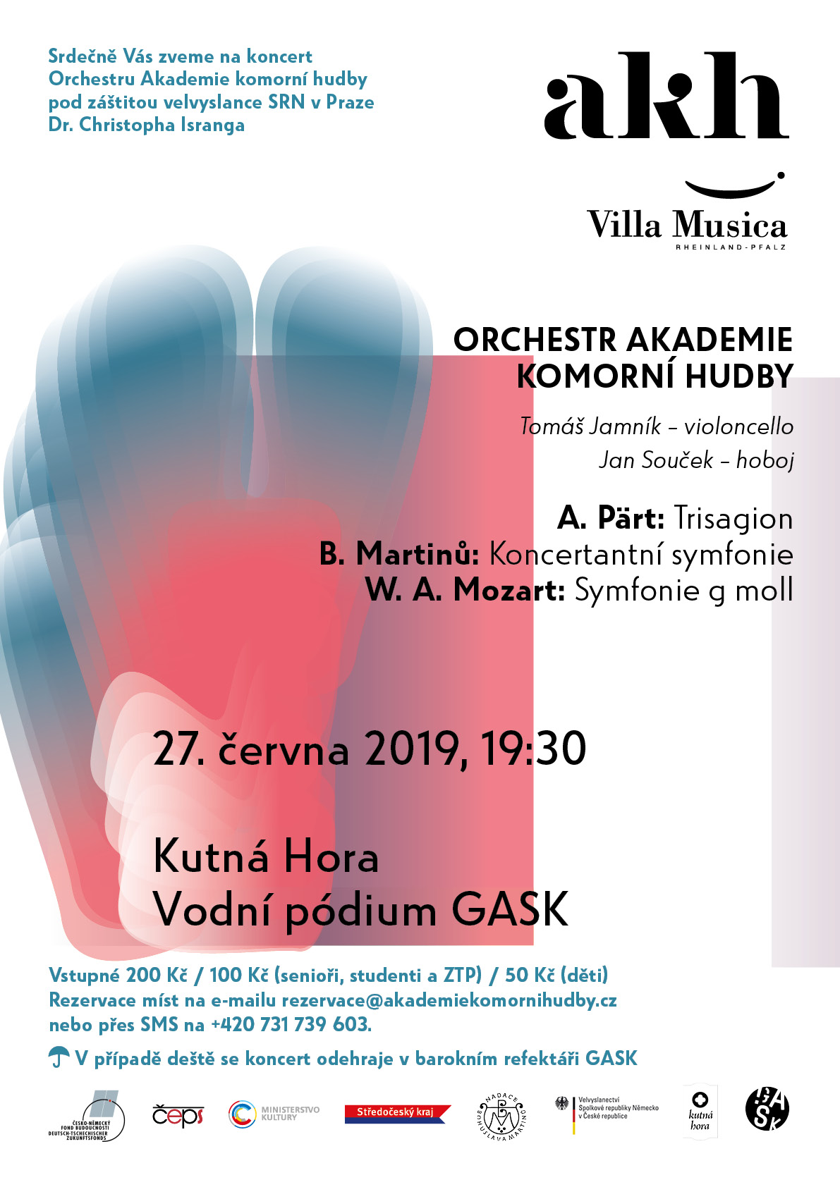 Orchestr složený ze špičkových mladých hudebníků, českých a německých studentů Akademie komorní hudby, vystoupí pod vedením violoncellisty Tomáše Jamníka a hobojisty Jana Součka od 26. do 28. června na open-air koncertech na několika místech ve Středočeském kraji. V Kutné Hoře potěší posluchače 27. června na vodním pódiu v zahradách GASK.