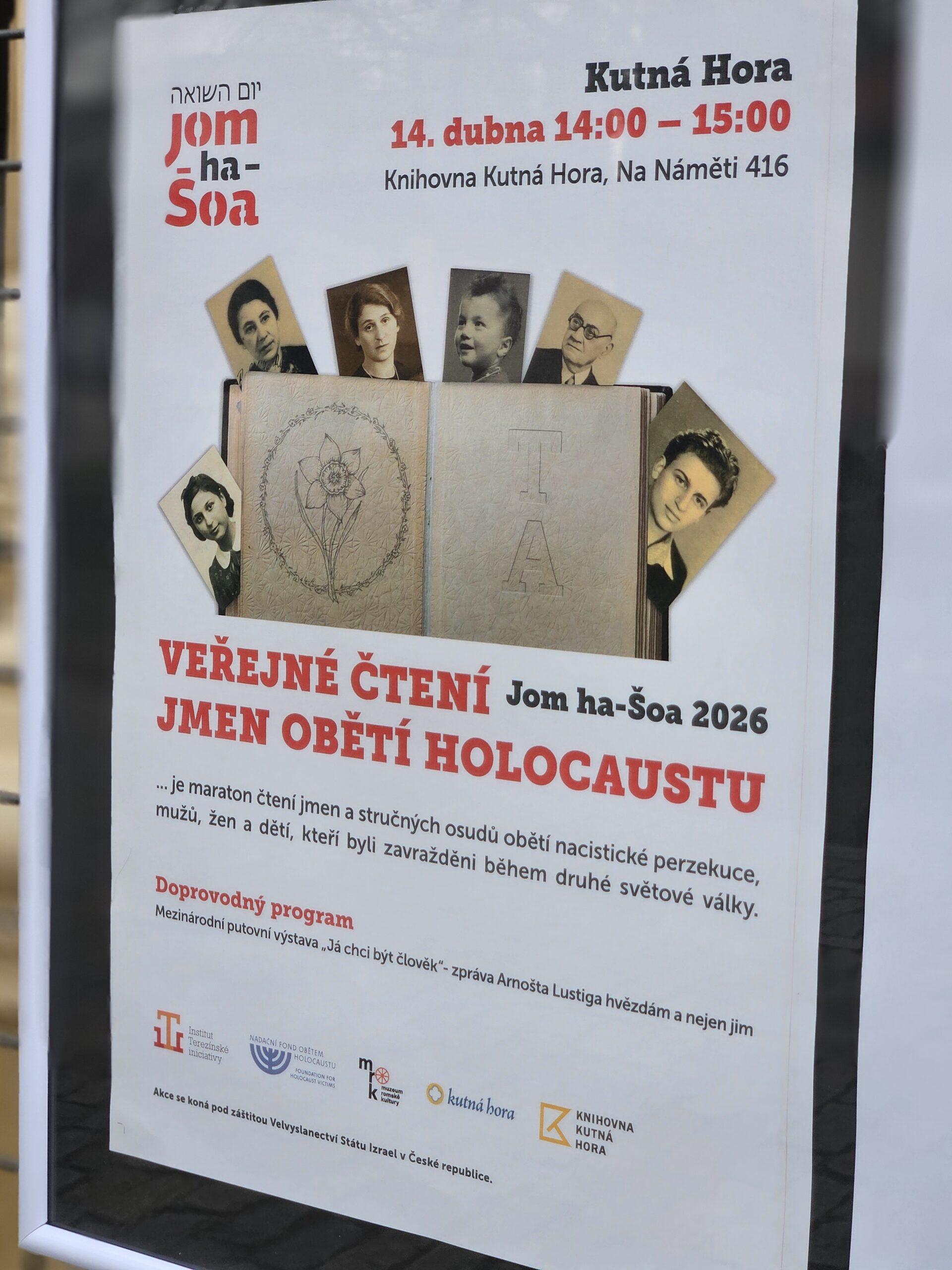 Jom ha-Šoa, veřejné čtení jmen obětí holocaustu, se uskutečnilo 14. dubna na prostranství před kutnohorskou knihovnou. Z reproduktorů již po jednadvacáté zaznívala jména mužů, žen i dětí, kteří byli pro svůj původ diskriminováni a během druhé světové války nesmyslně zavražděni nacistickým režimem. Do čtení jmen a stručných osudů obětí nacistické perzekuce se za město Kutná Hora zapojila místostarostka Kateřina Špalková, pracovníci knihovny, žáci ZŠ Jana Palacha, studenti průmyslové školy i další zájemci z řad veřejnosti.