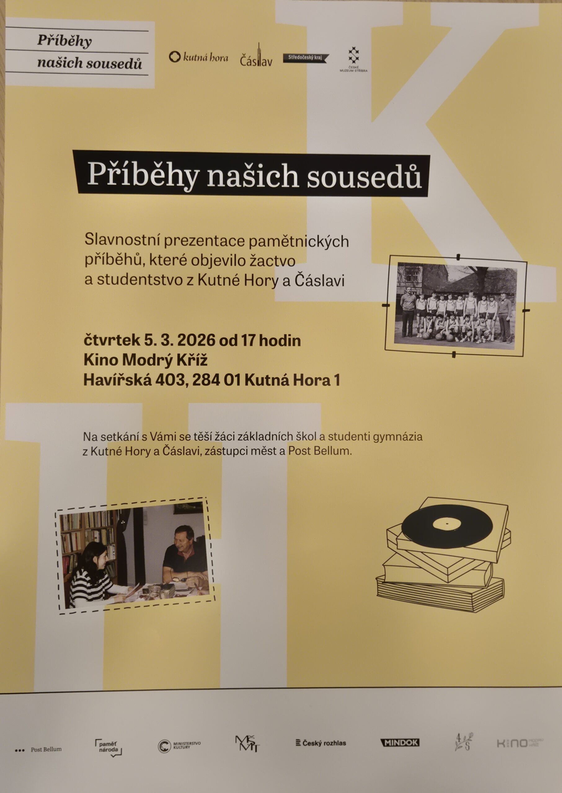 Akce v kině Modrý kříž se kromě studentů, pedagogů a některých pamětníků, jejichž příběhy byly prezentovány, zúčastnili i starosta Kutné Hory Lukáš Seifert a zástupkyně organizace Post Bellum Dominika Kopčíková.