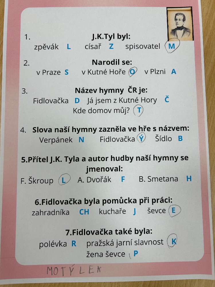 Od slov hymny to byl další krok k tomu, aby se žáci vydali po stopách samotného autora. Takže už ví, co původně znamenala fidlovačka a jak to bylo se vznikem naší státní hymny. Zjistili, kde miláček národa žil, působil, jaká díla napsal. Také jsme řešili kvízy, vymýšleli obměny slov hymny.