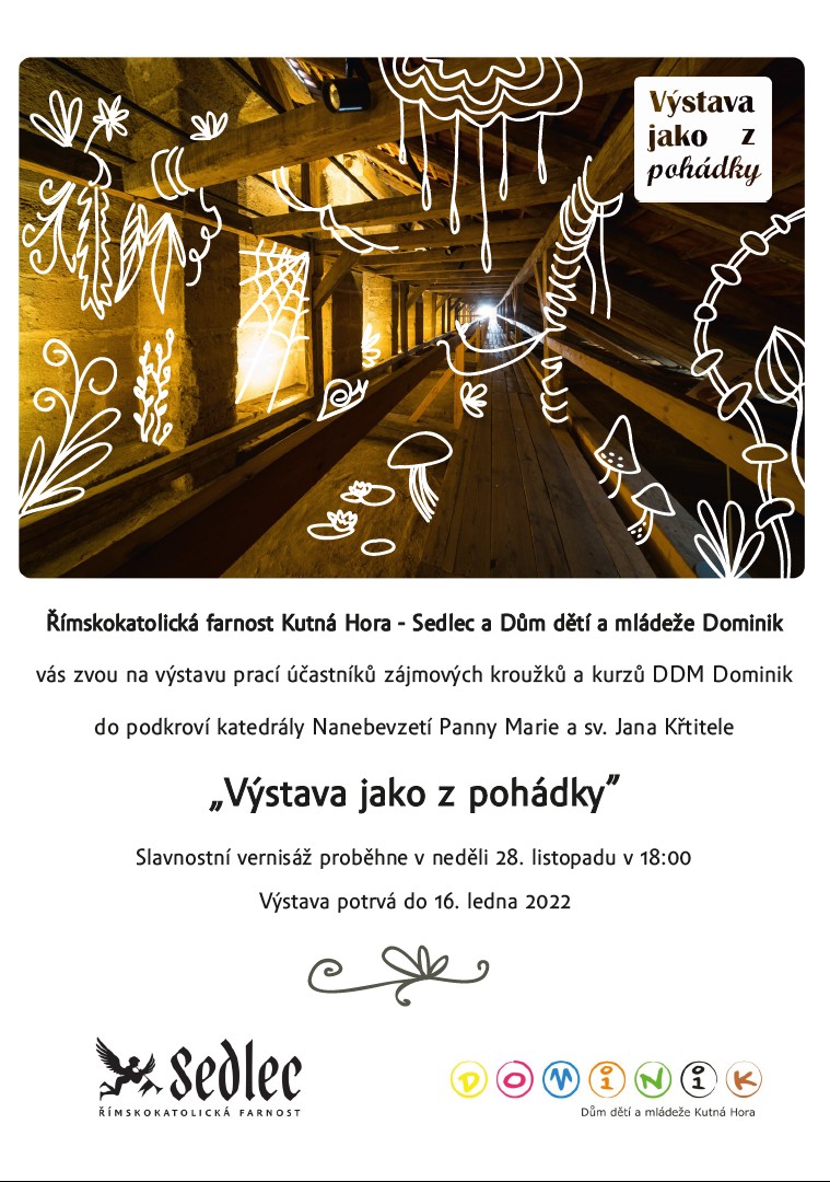 V podkroví katedrály Nanebevzetí Panny Marie a sv. Jana Křtitele se chystá vánočně laděná výstava s poetickým názvem Výstava jako z pohádky. A byla to právě půda katedrály, která vedla autorku konceptu výstavy, Janu Štolbovou, k myšlence uspořádat v čase předvánočním výstavu vycházející z pohádek a jejich laskavého poselství. Veškeré malby, kresby, fotky a další instalace z různých materiálů tak vycházejí z poetiky pohádek a jsou inspirovány více i méně známými příběhy, ke kterým se děti i dospělí v období vánoc rádi vracejí.