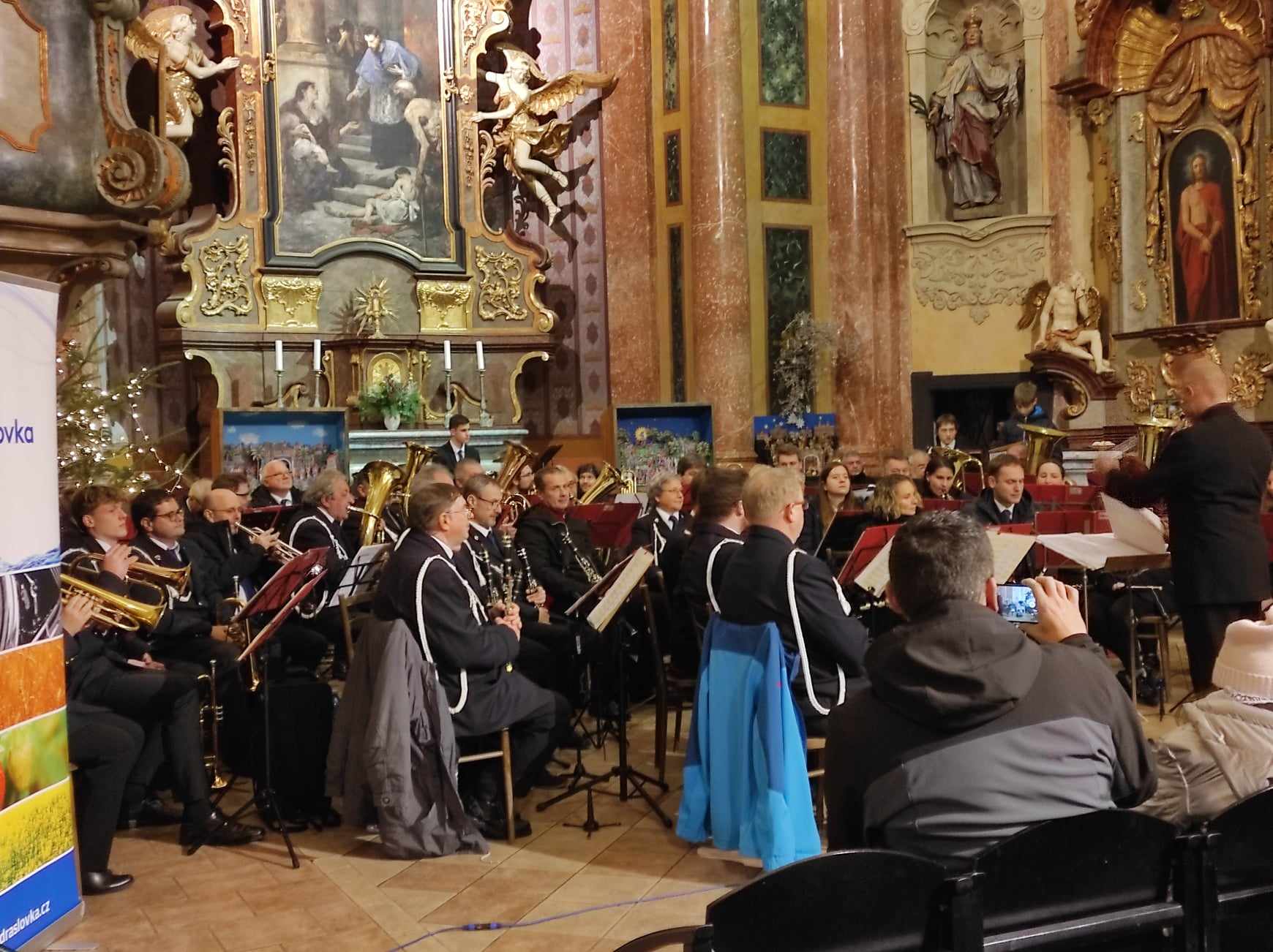 V první polovině koncertu si návštěvníci koncertu užili známé melodie klasické hudby v úpravě pro dechový orchestr. Zazněly skladby Air Johanna Sebastiana Bacha v úpravě Karla Bělohoubka, Largo od Georga Friedricha Händla nebo Intermezzo Simfonico z opery Cavalleria rusticana od italského skladatele Pietra Mascagniho. V Písni vycházejícího slunce od Vladimíra Studničky sklidil velký potlesk Radek Jech za sólo na trubku, které rozeznělo celý prostor kostela. Orchestr představil také německého skladatele Edmunda Löfflera tvořícího ve 20. století a jeho Mši pro dechový orchestr, posluchači si vyslechli části Gloria, Offertorium a Agnus Dei. Jednotlivé části obohatil procítěným přednesem vánočních veršů Marek Franc a navázal zpěvem vánoční koledy Jak jsi krásné neviňátko. Tím se koncert dostal do své druhé poloviny. Další koledu, Štědrý večer nastal, krásně zazpívala Alička Kučerová. Oba mladí sólisté navštěvují ZUŠ v Kutné Hoře. V sólech se dále představila Zdenka Mačinová a Lukáš Bořek. U dirigentského pultíku se střídali Lukáš Bořek, Vladimír Zeman a Lucie Veselá.