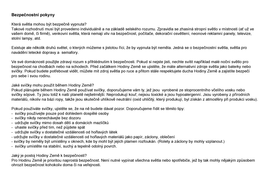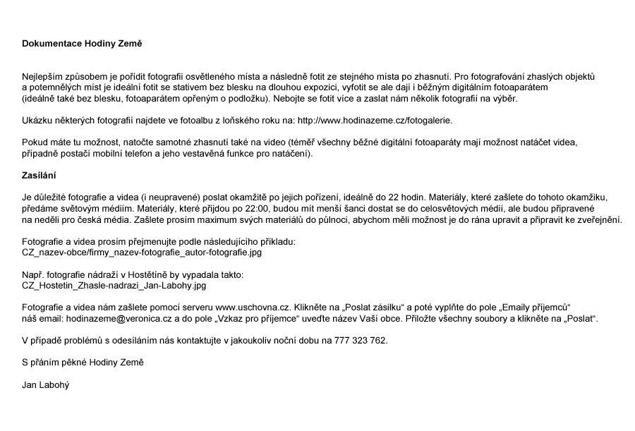 „Připomeňme si dvě důležité informace: zdokumentujte, prosím, Hodinu Země fotografiemi a videem. Podrobné instrukce, jak zhasínání zdokumentovat, najdete v příloze. Své materiály nám zašlete ideálně ještě v sobotu do 22:00. Dbejte prosím bezpečnostních předpisů a vyvarujte se manipulaci s otevřeným ohněm v místech, kde hrozí nebezpečí požáru,“ připomíná Magda Vodičková z ekologického institutu Veronica.