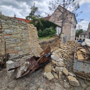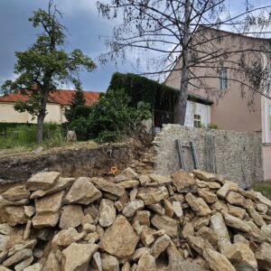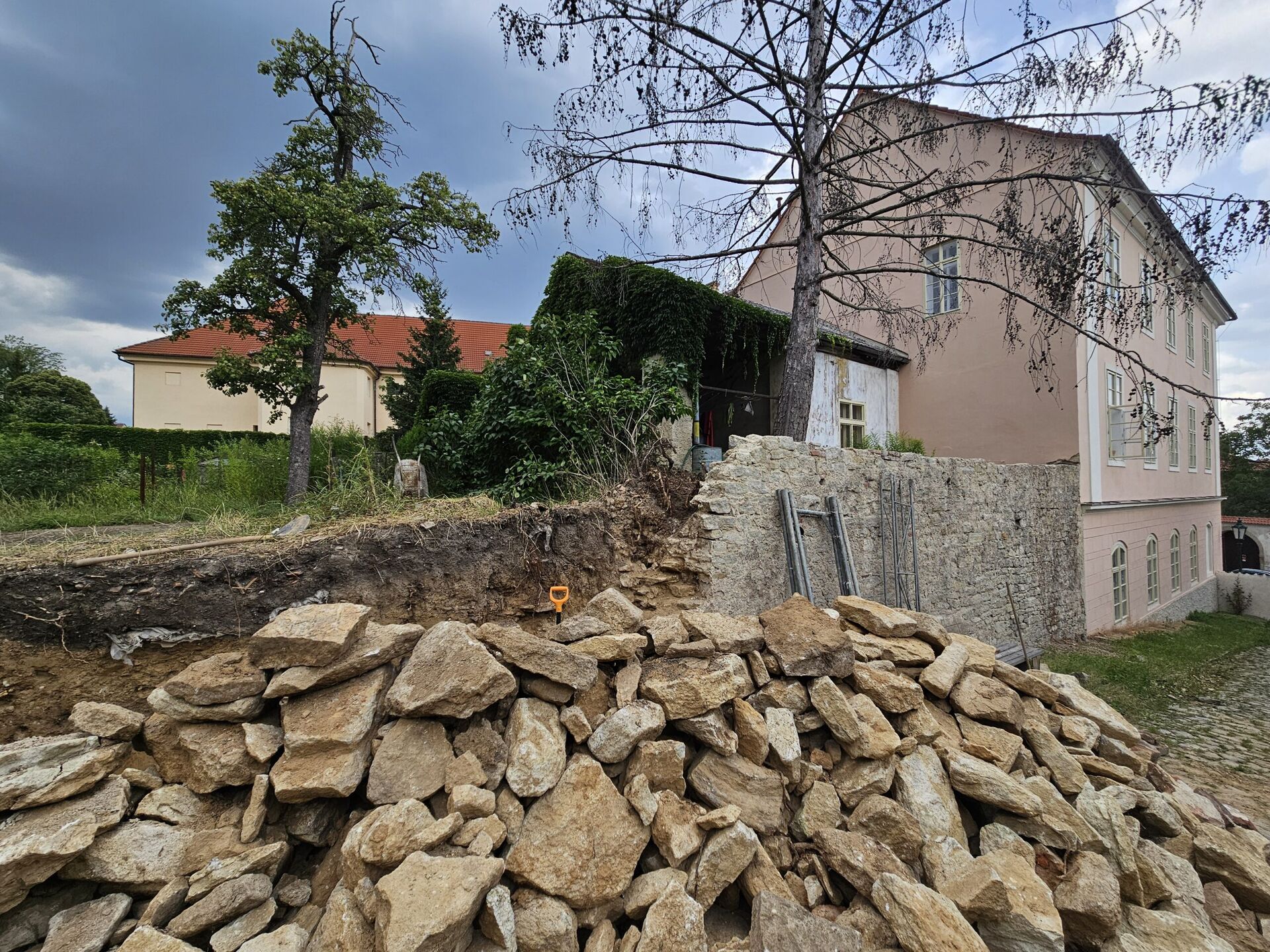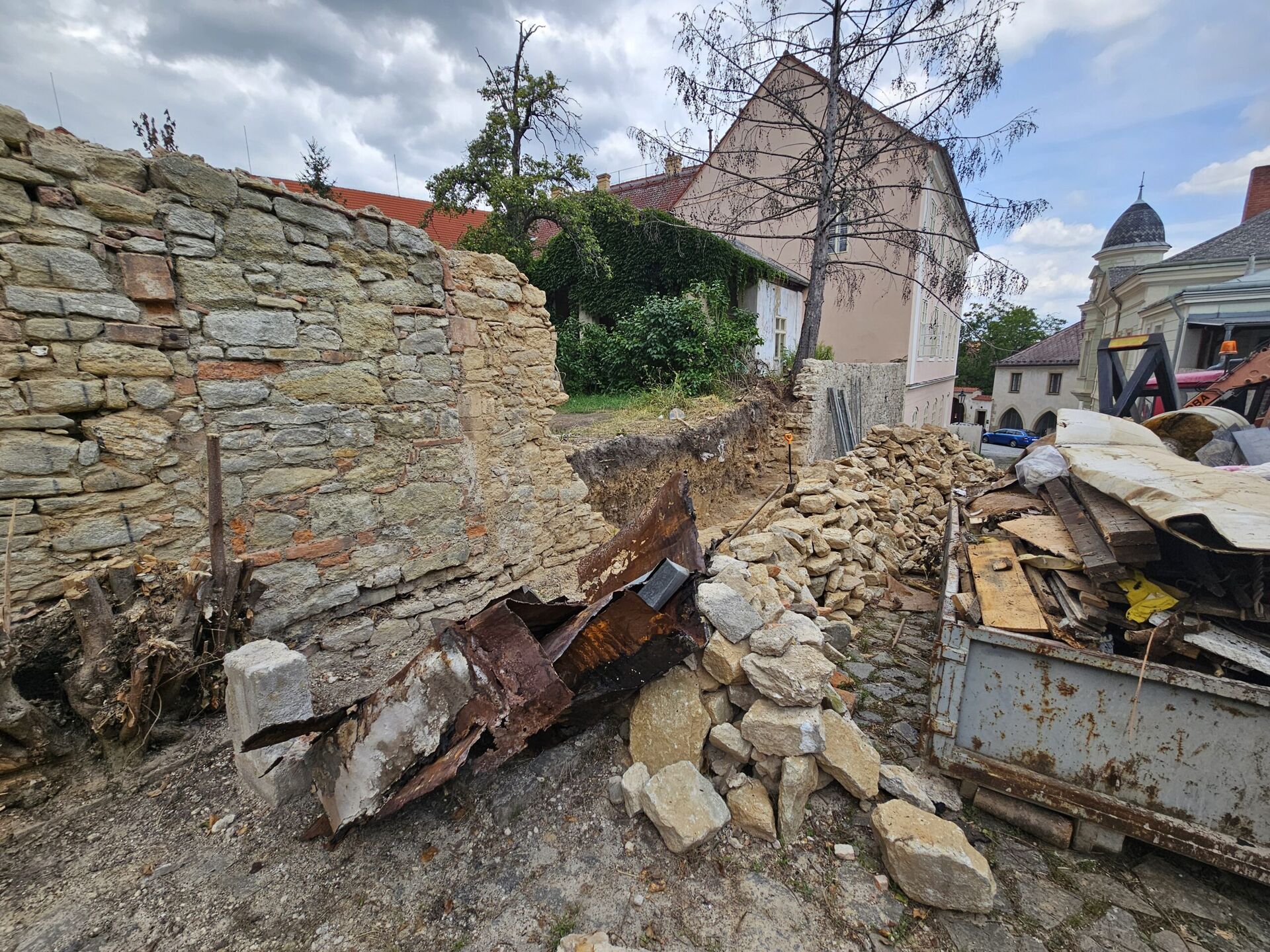 Opravu kamenné ohradní zdi u domu čp. 56 na náměstí Národního odboje v Kutné Hoře v délce 45 m zahájilo město letos v červenci. Jak doplnila Věra Janatová z oddělení památkové péče, práce si vyžádají investici bezmála 2,4 milionu korun včetně DPH, z toho 390 tisíc korun činí dotace z programu regenerace městských památkových rezervací a městských památkových zón Ministerstva kultury České republiky. Souběžně s tím pracovníci prováděcí firmy zajistili vyklizení prostranství. Termín dokončení prací je dle smlouvy o dílo 30. listopadu 2025.