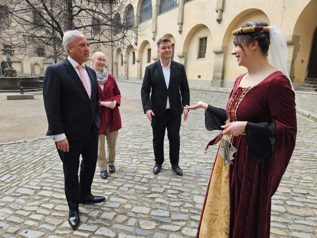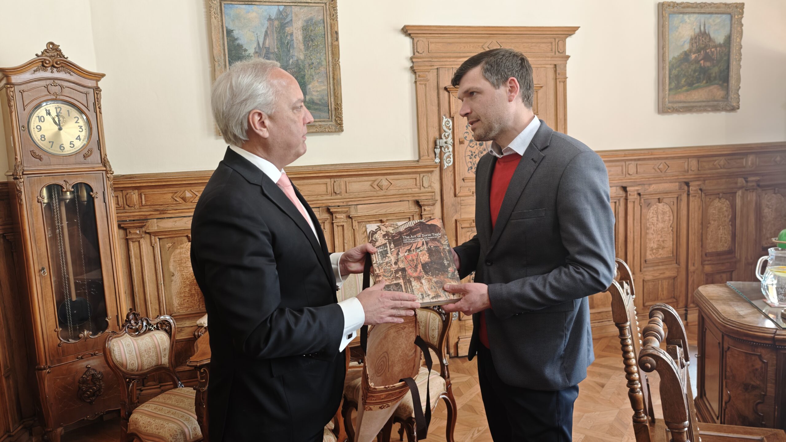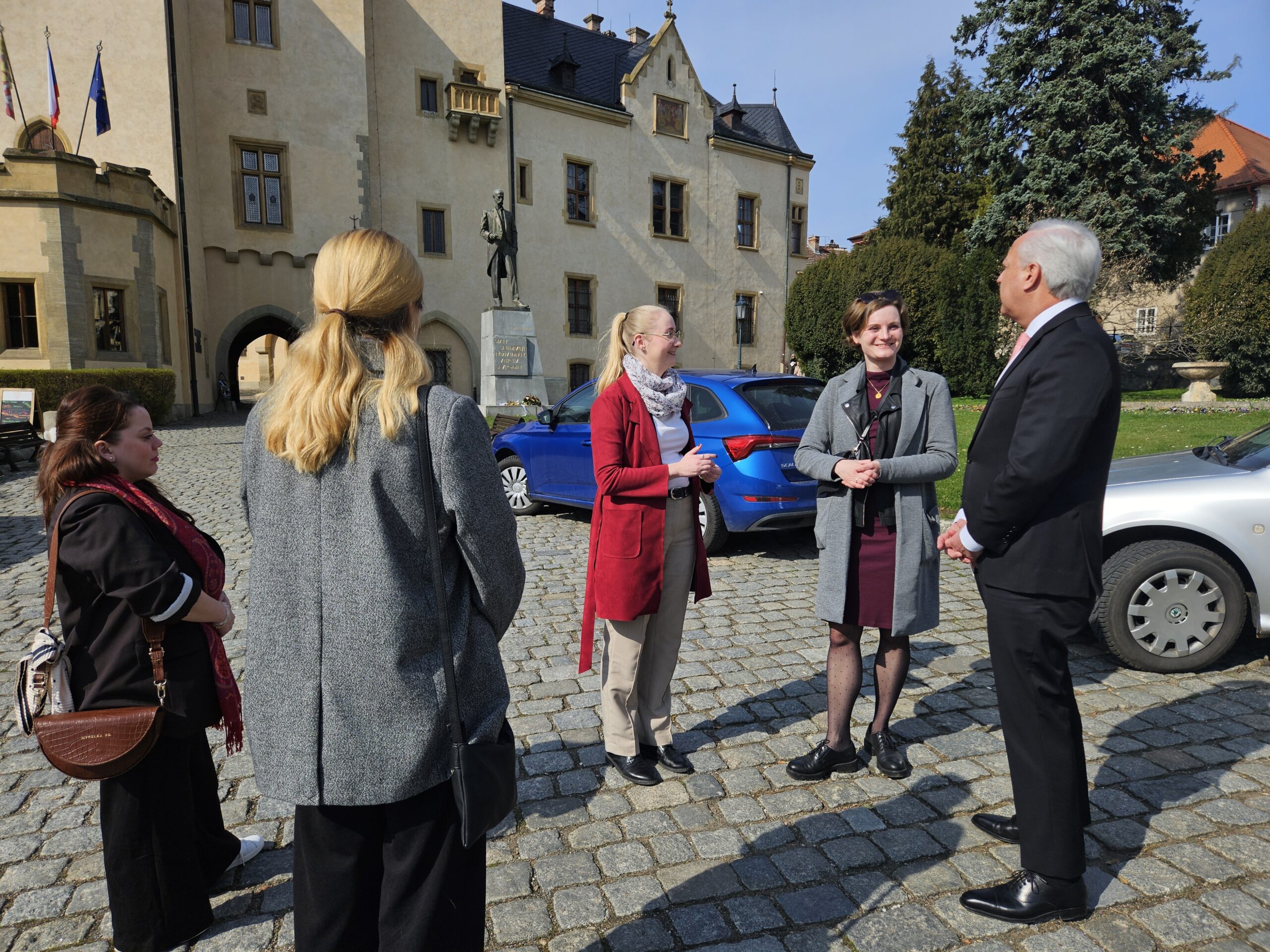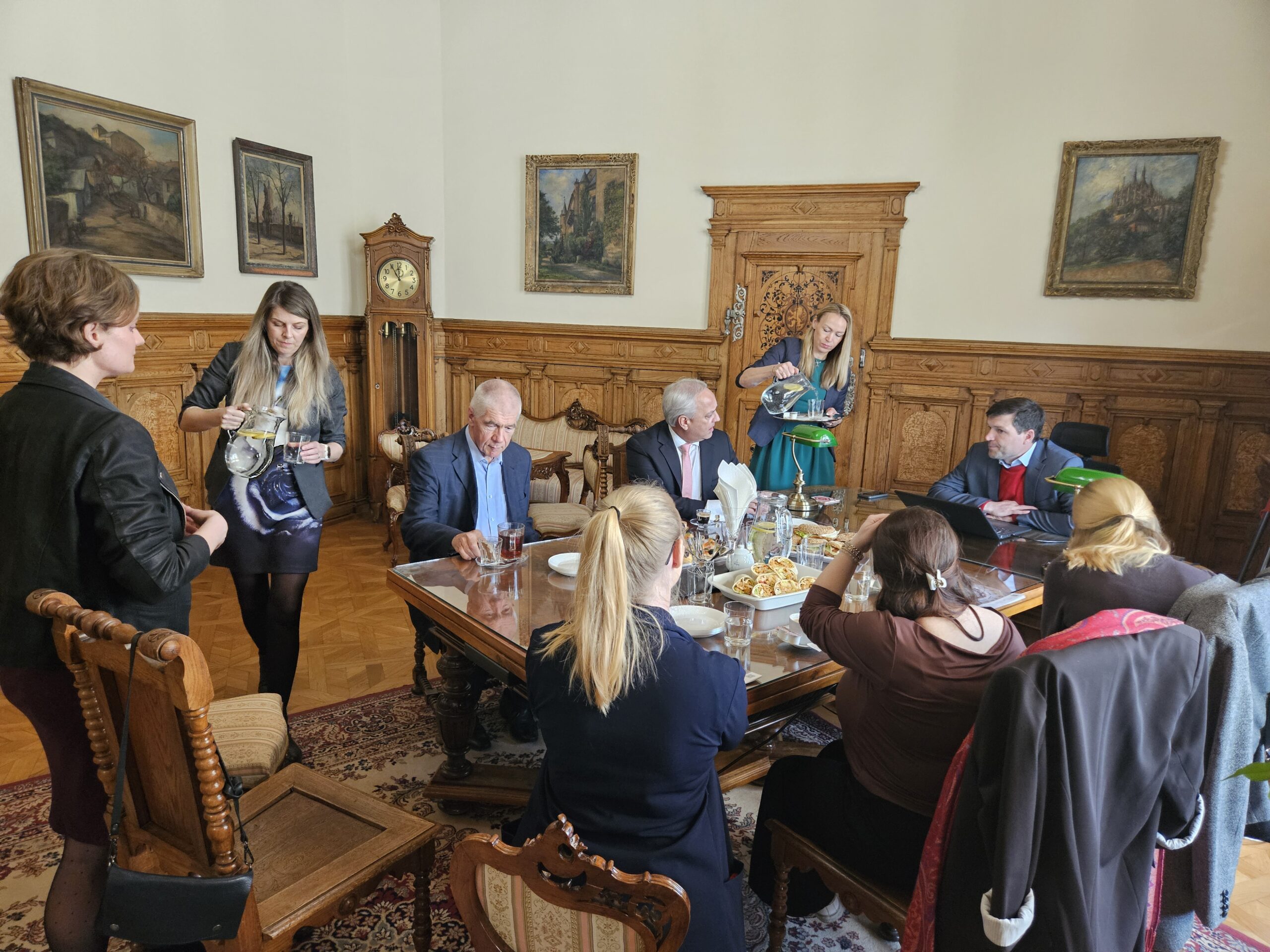 Setkání ve Vlašském dvoře začalo v kanceláři starosty města Lukáše Seiferta, kde se k němu připojil bývalý starosta a zastupitel Ivo Šanc. Diskutovalo se o aktuálním dění ve městě, životním prostředí, rozvoji podnikání a obchodu, ale také o cestovním ruchu v souvislosti s pojmem overturismus, kultuře, sportu a vzdělávání.