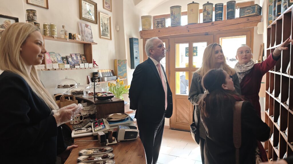 Další zastávkou bylo Muzeum čokolády a čokoládovna, kde degustace přinesla panu velvyslanci vzpomínky na dětství strávené na plantážích, kdy trhali kakaové lusky a ochutnávali pražené kakaové boby. Překvapením byla i možnost nahlédnout v Českém muzeu stříbra do důlního díla pod Jezuitskou kolejí.