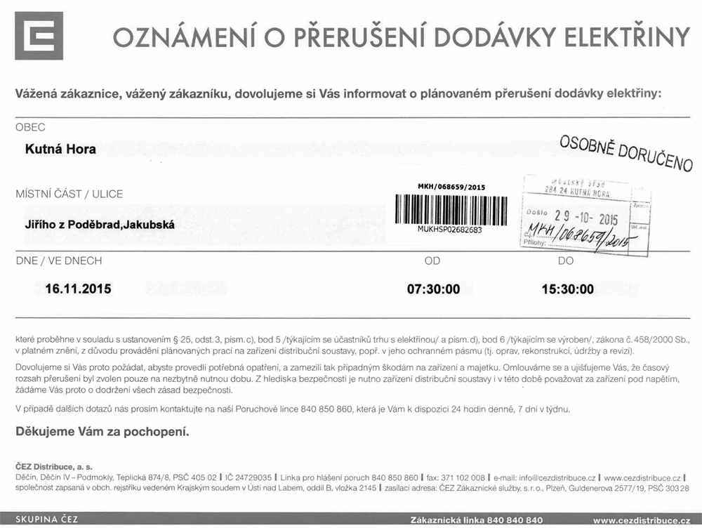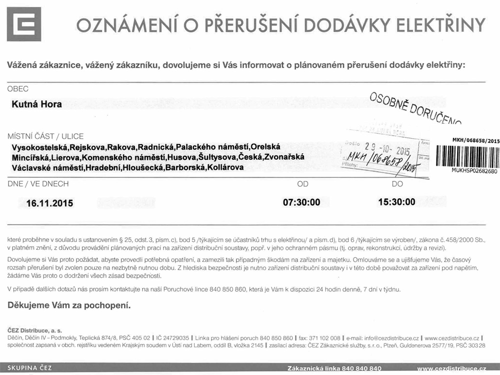 Pozor! Přerušení dodávky elektřiny 16. listopadu se dotkne také budov Městského úřadu Kutná Hora v Radnické ulici a na Václavském náměstí. Svoji návštěvu v tento den si raději proto domluvte dopředu telefonicky.