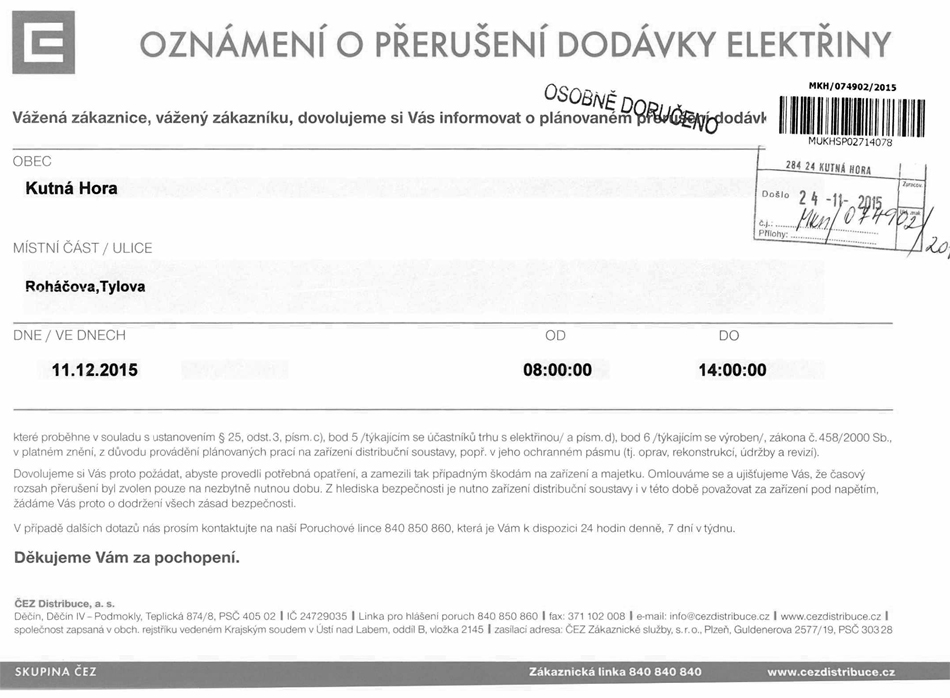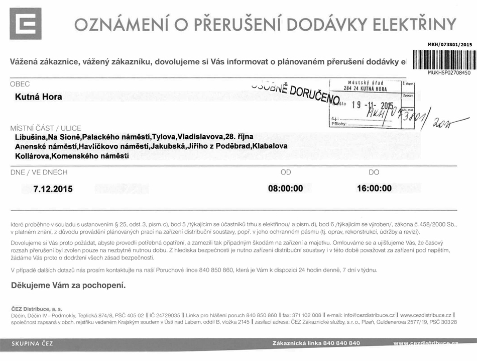 Pozor! Přerušení dodávky elektřiny 7. prosince se pravděpodobně dotkne také budovy Městského úřadu Kutná Hora na Havlíčkově náměstí (Vlašský dvůr). Svoji návštěvu v tento den si raději proto domluvte dopředu telefonicky.
