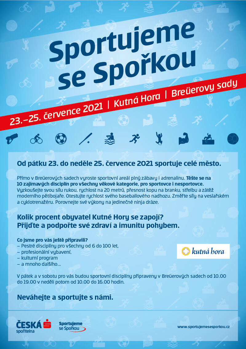 Vyzkoušet si postupně jednotlivé disciplíny měli zájemci příležitost již v uplynulých týdnech, kdy se akce v parku konala. „Díky tomu, že je akce oblíbená a přináší radost z pohybu obyvatelům Kutné Hory i návštěvníkům, tak jsem se rozhodli na stejném místě uspořádat velkou akci, na kterou přivezeme všechny disciplíny najednou a z krásného parku uděláme sportovní centrum,“ uvedla Pavla Ficová z České spořitelny, a.s. a doplnila, že disciplíny jsou určena pro všechny zájemce od 6 do 100 let. K dispozici bude profesionální vybavení, připraven je kulturní program, soutěž mezi městy a mnoho dalšího. „V pátek 23. 7. a v sobotu 24. 7. pro vás budou sportovní disciplíny připraveny v Breüerových sadech od 10.00 do 19.00 v neděli 25. 7. potom od 10.00 do 16.00 hodin. Neváhejte a sportujte s námi,“ zvou pořadatelé.