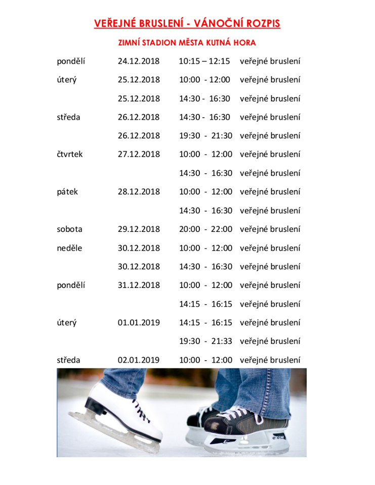 Zimní stadion v Kutné Hoře láká na sváteční i povánoční bruslení. Veřejné bruslení připravují na Štědrý den i oba dva vánoční svátky.