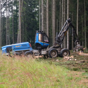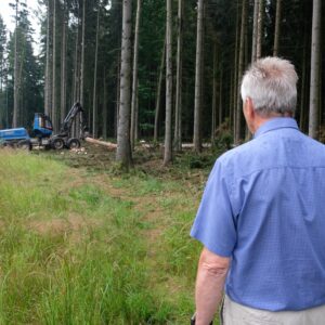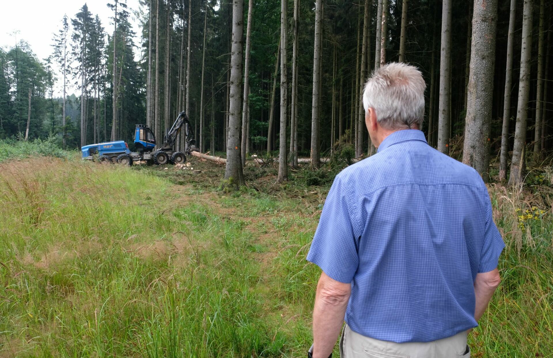 Účastníci setkání poté vyrazili do lesa v Radvančicích, kde v těsném sousedství nově obnoveného rybníku pokračuje likvidace kůrovcové kalamity pomocí těžké techniky, harvestoru.