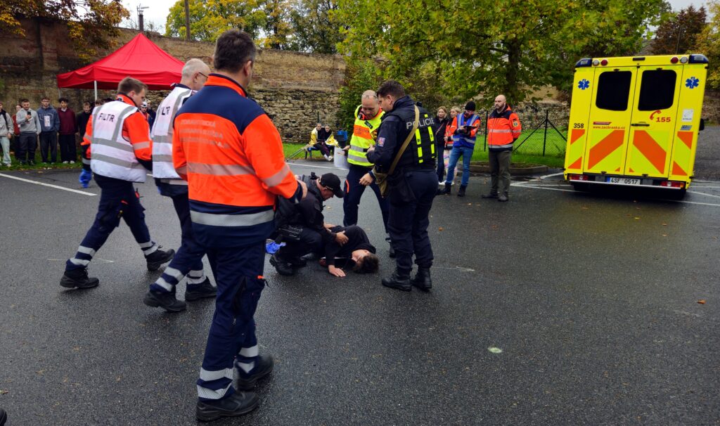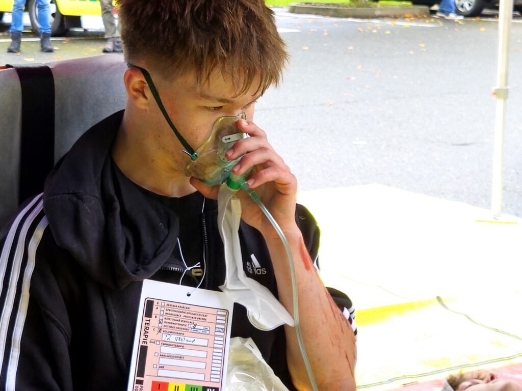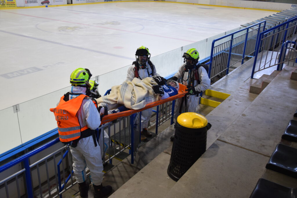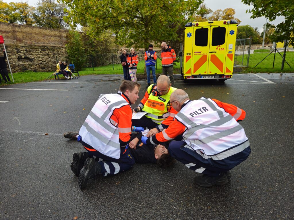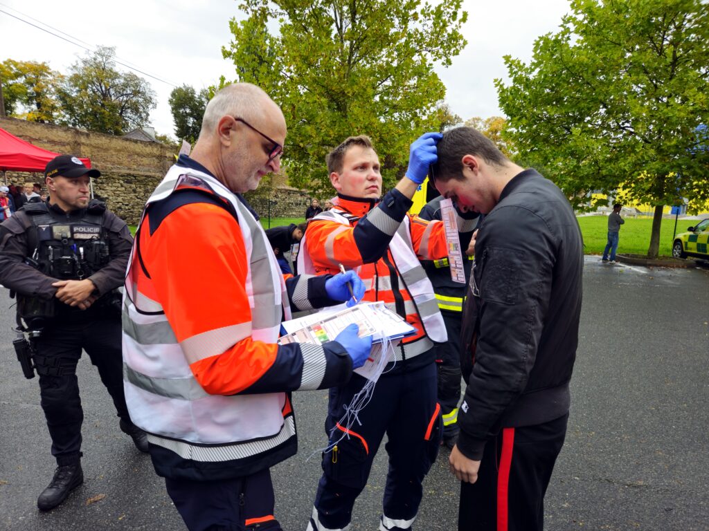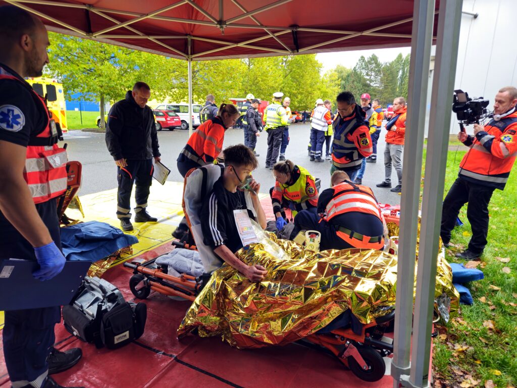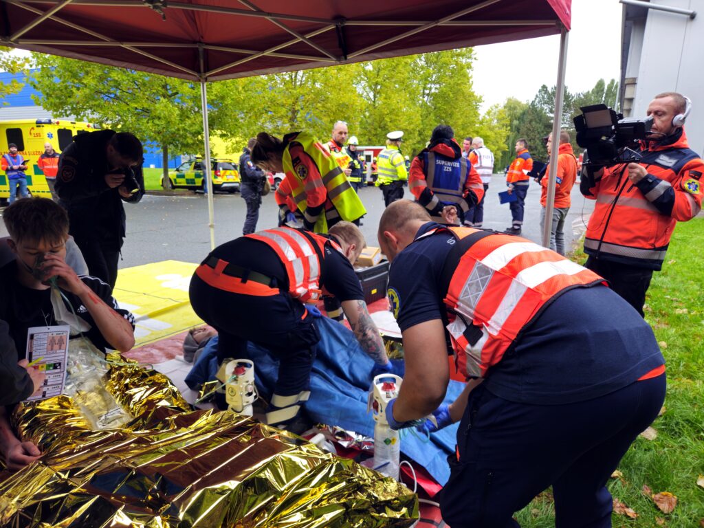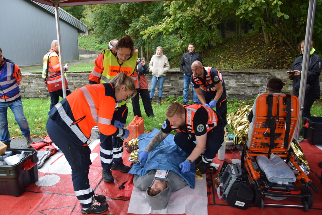 Po úspěšné evakuaci si figuranty převzala do péče zdravotnická záchranná služba, která zajišťovala první pomoc a další ošetření.