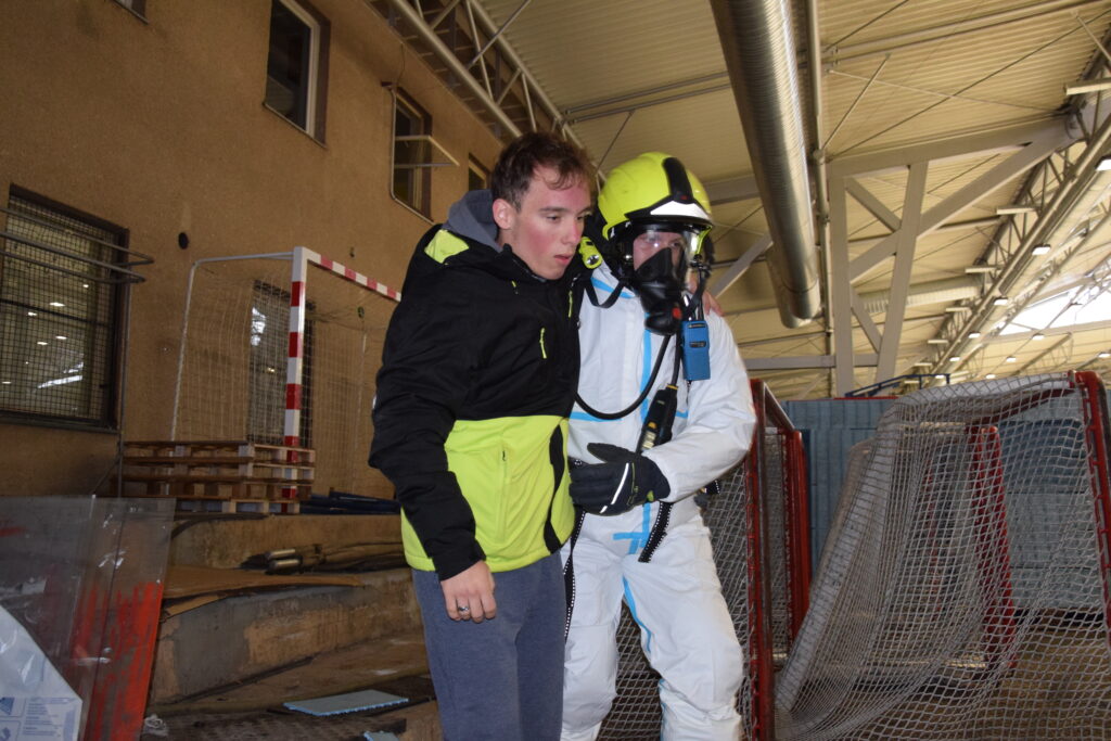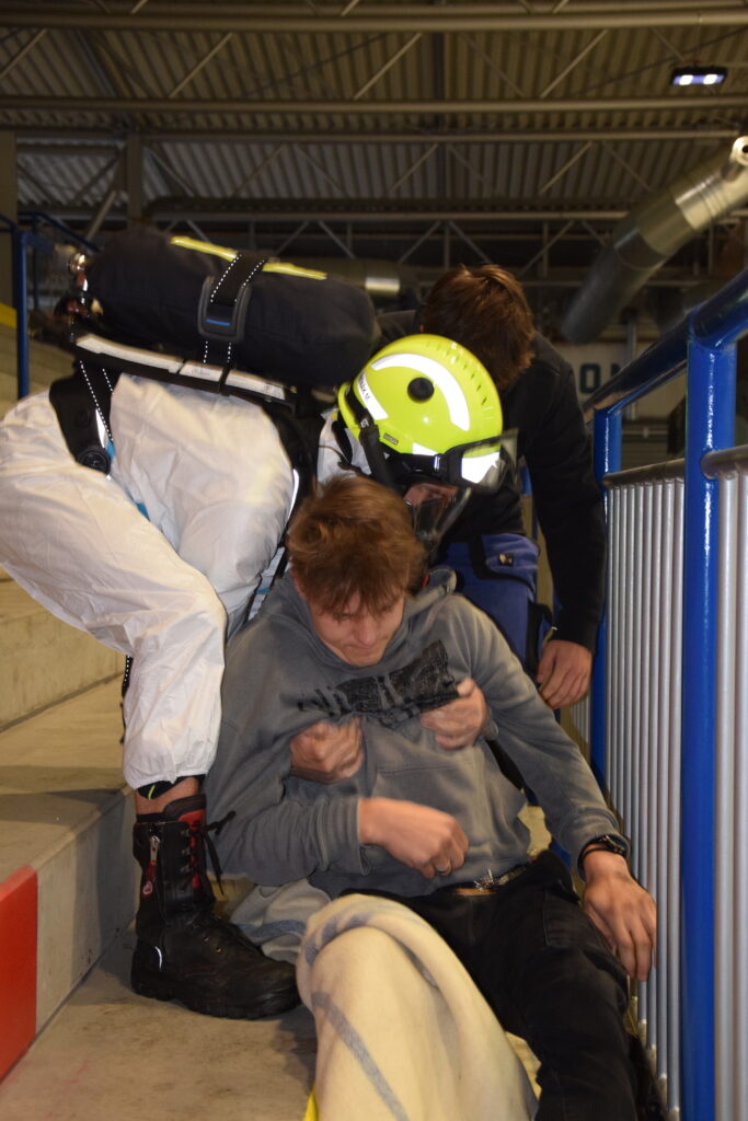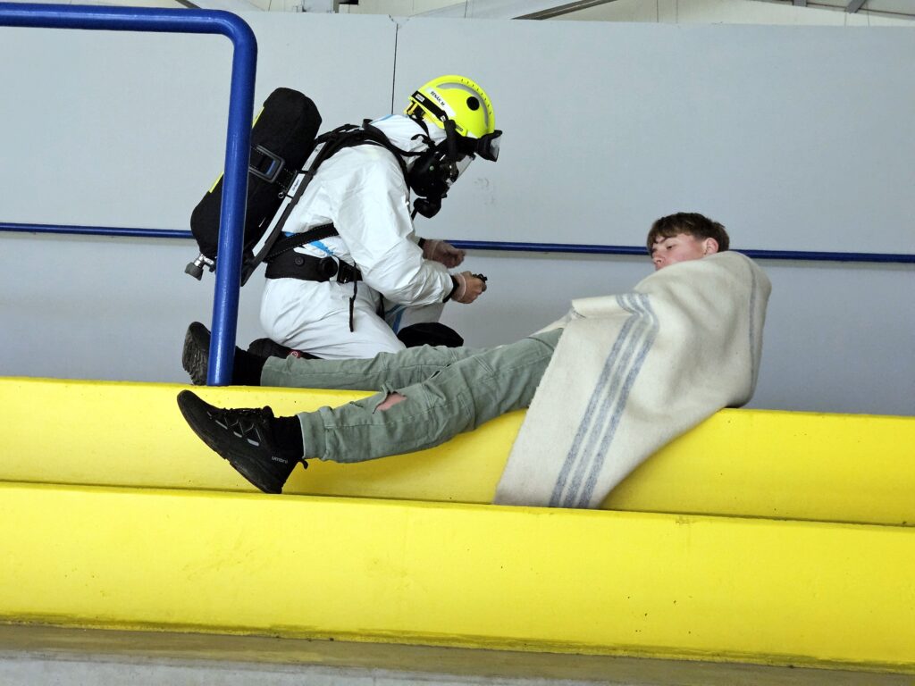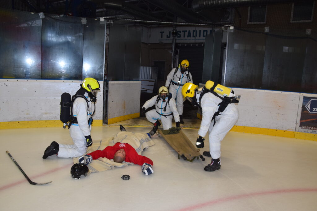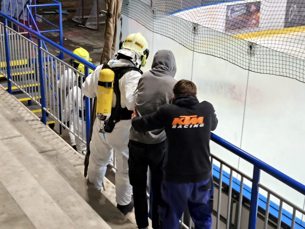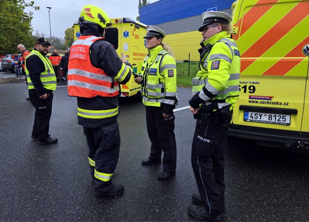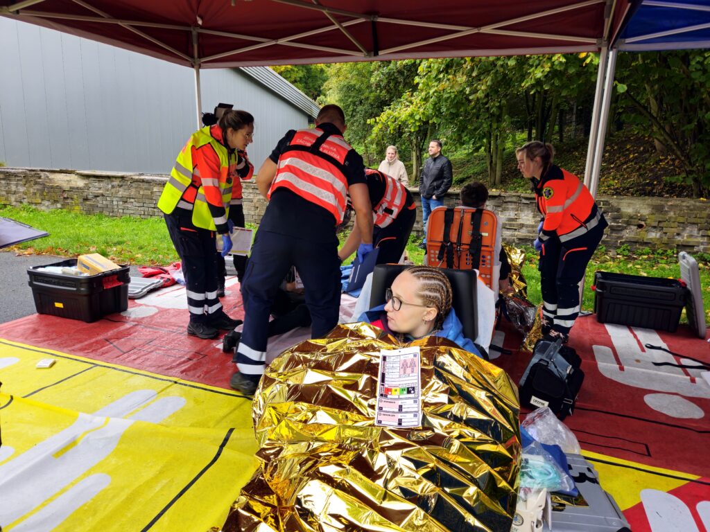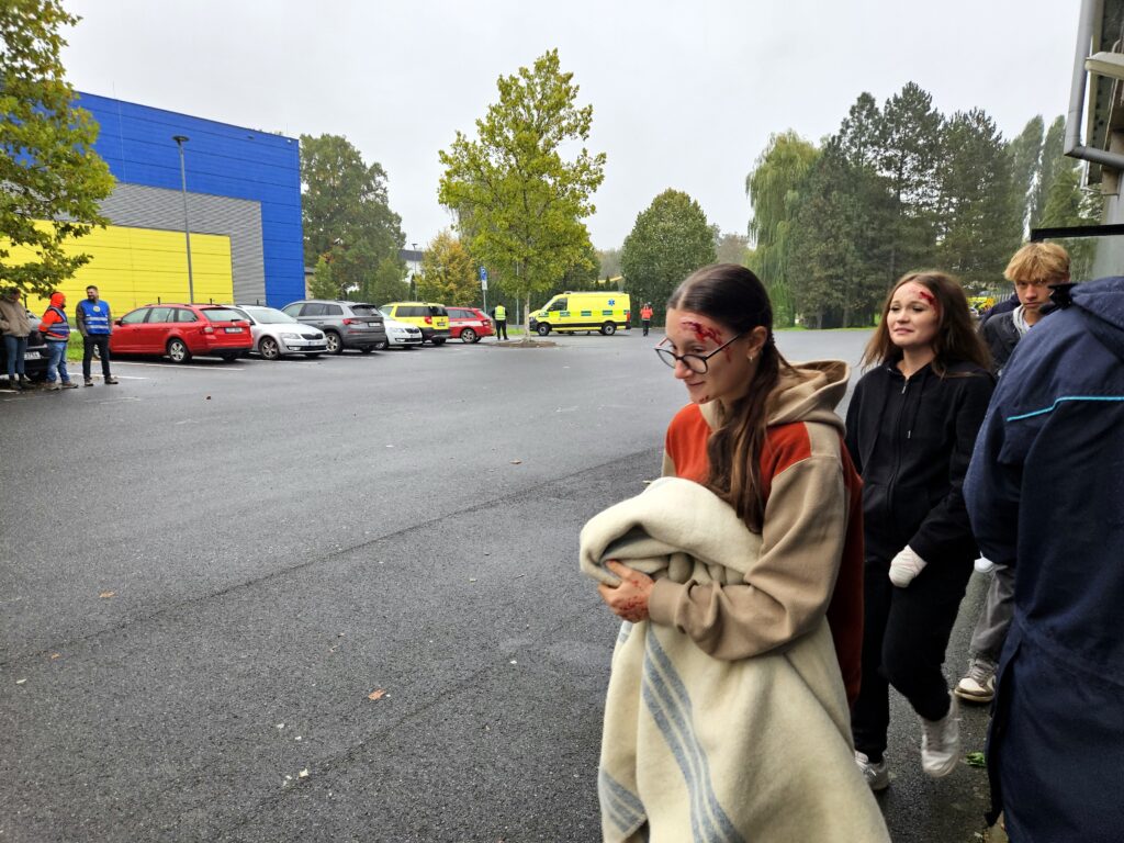 Po úspěšné evakuaci si figuranty převzala do péče zdravotnická záchranná služba, která zajišťovala první pomoc a další ošetření.