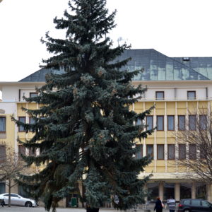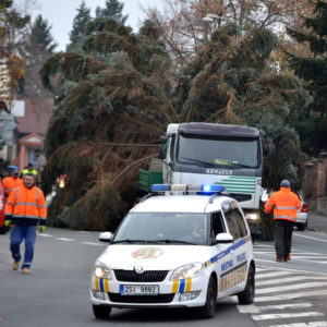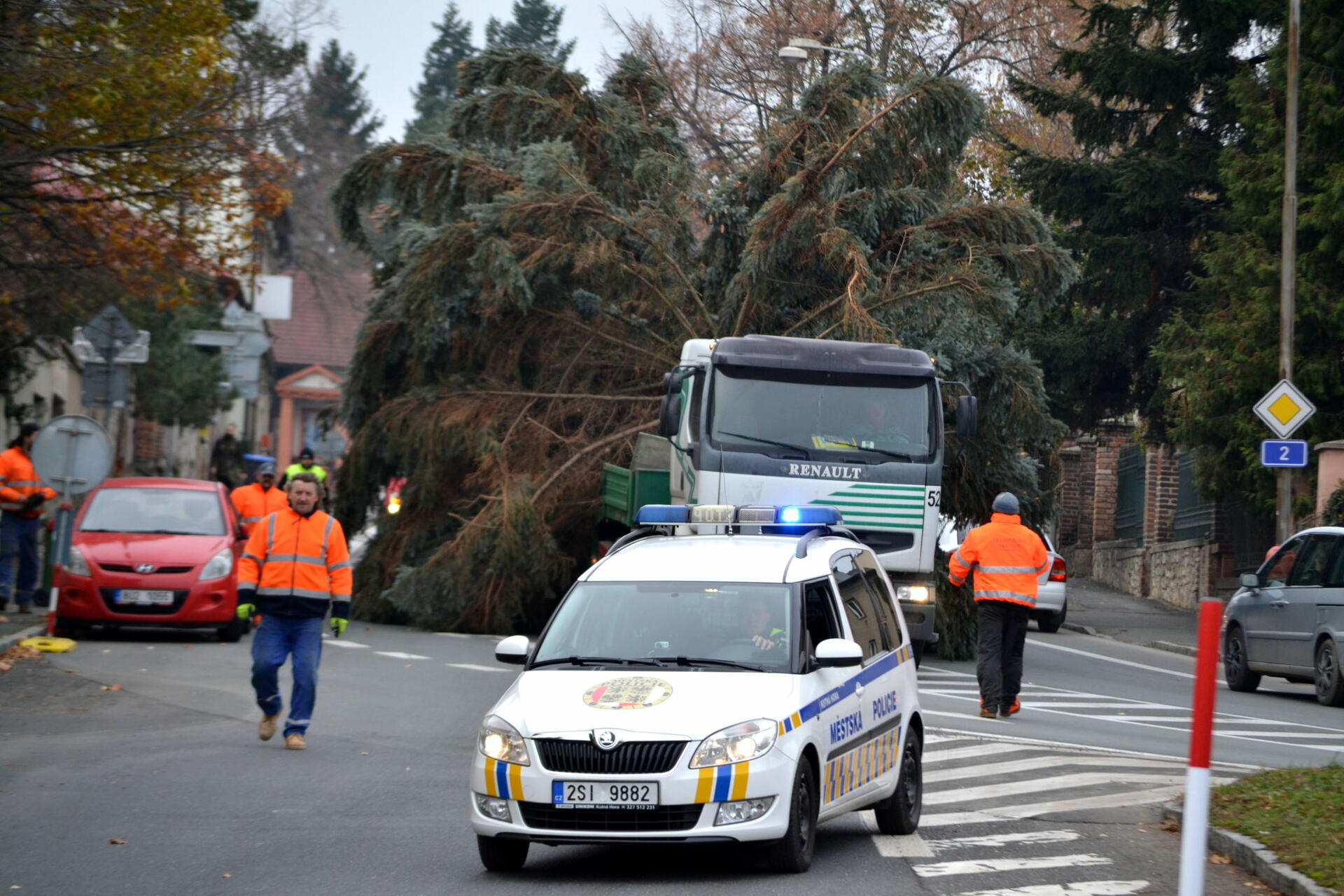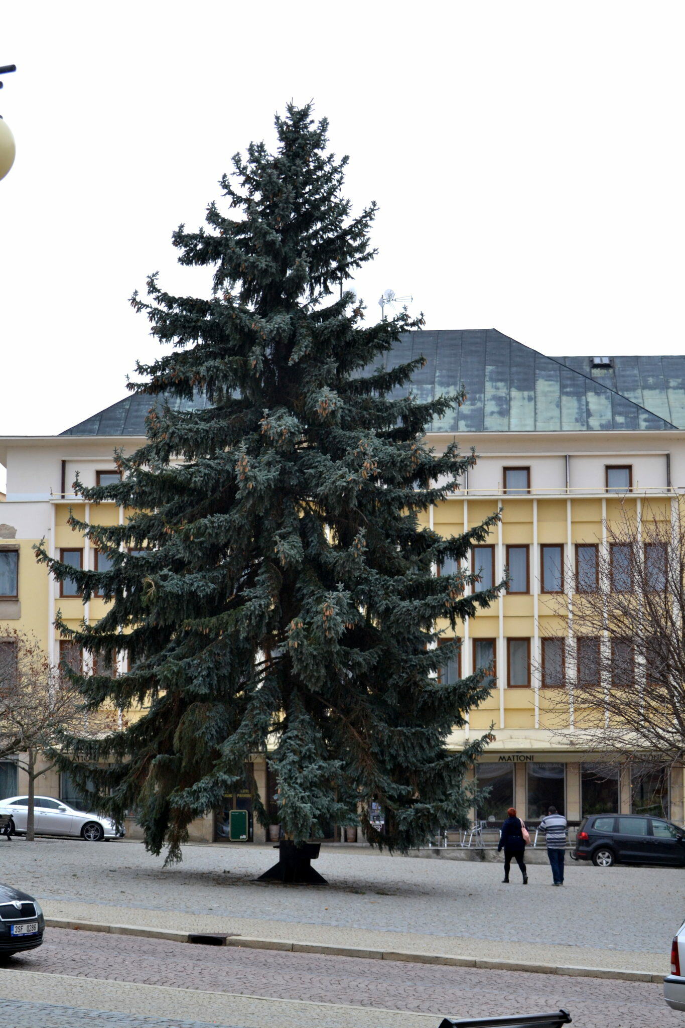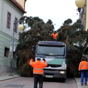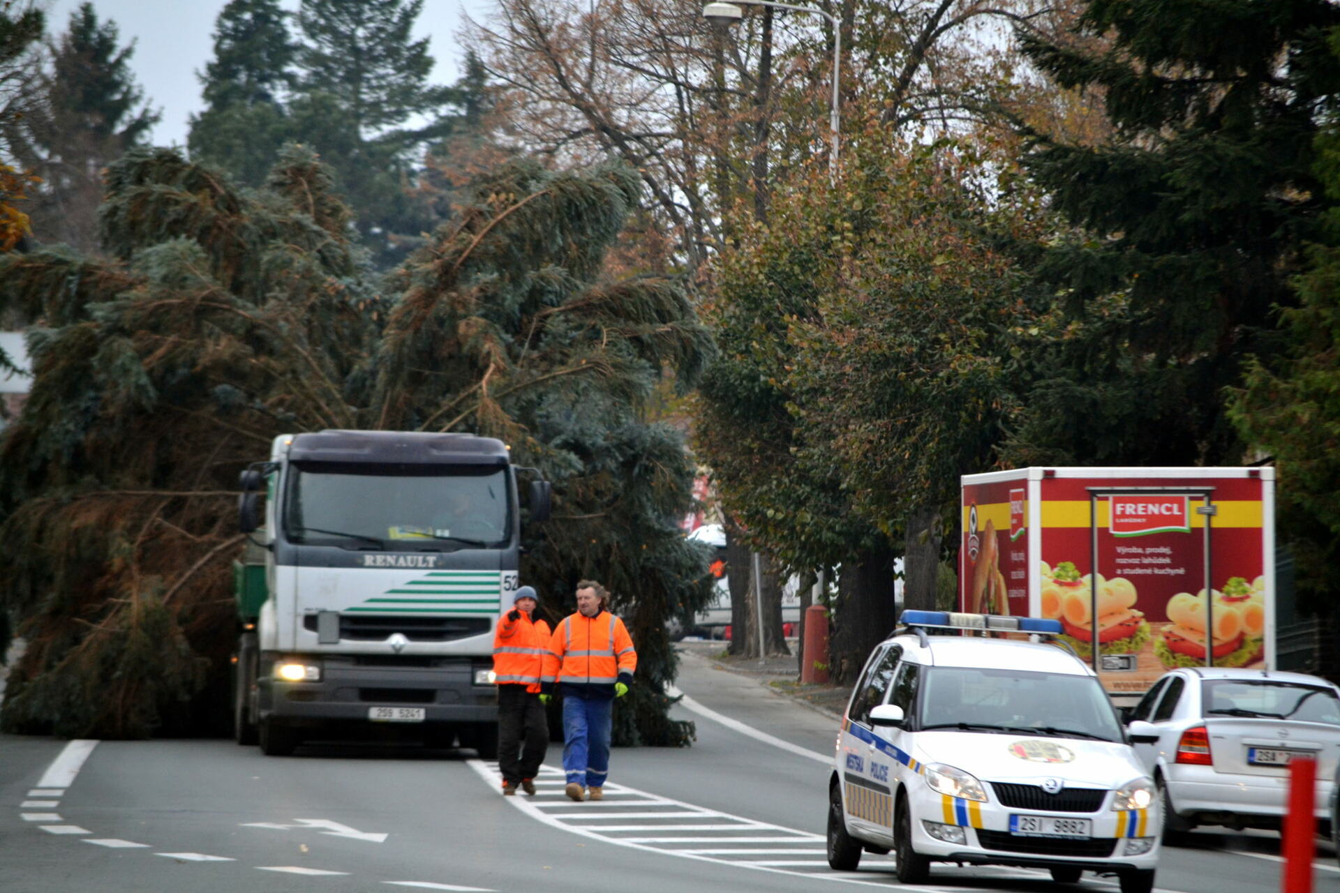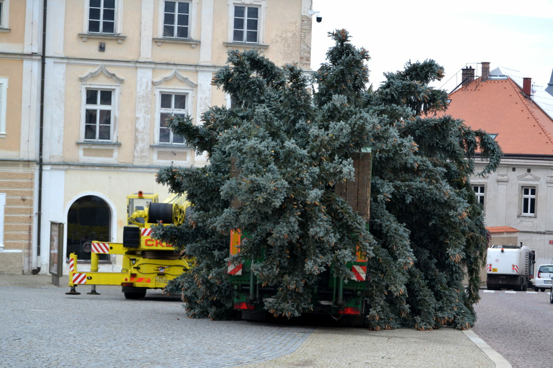 Vánoční smrk už stojí na náměstí, profesionálové z odborné firmy ho ozdobí během víkendu
