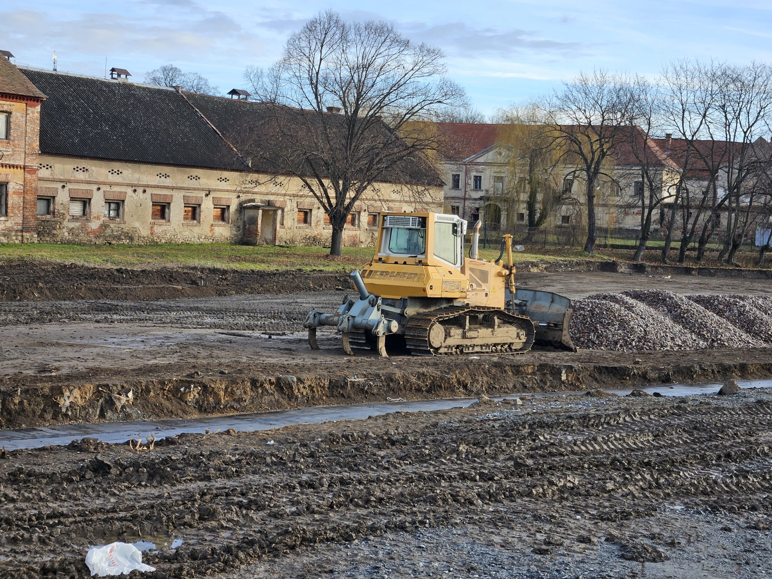 Práce pro město zajišťuje firma CE-DA servis s. r. o., Velký Osek V současné době pokládá kanalizaci jak dešťovou, tak splaškovou, naváží a hutní podkladové vrstvy, zakládá stavební objekty a připravuje podkladové vrstvy zeleně.